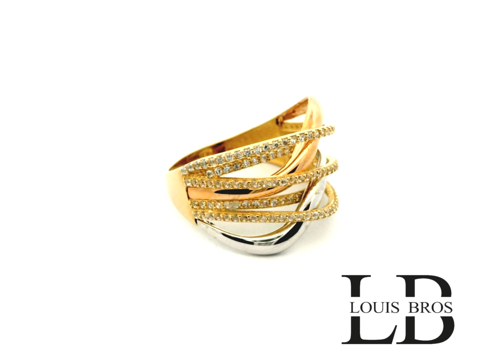 Deze schitterende ring is vervaardigd uit 14 karaat tricolor goud (4.43 gr), waarbij geel-, wit- en rosegoud op elegante wijze samenkomen. Het speelse kleurenspel geeft de ring een unieke en luxe uitstraling. De ring is verder verrijkt met fonkelende zirkonia’s, die zorgen voor een sprankelende schittering bij iedere beweging.
