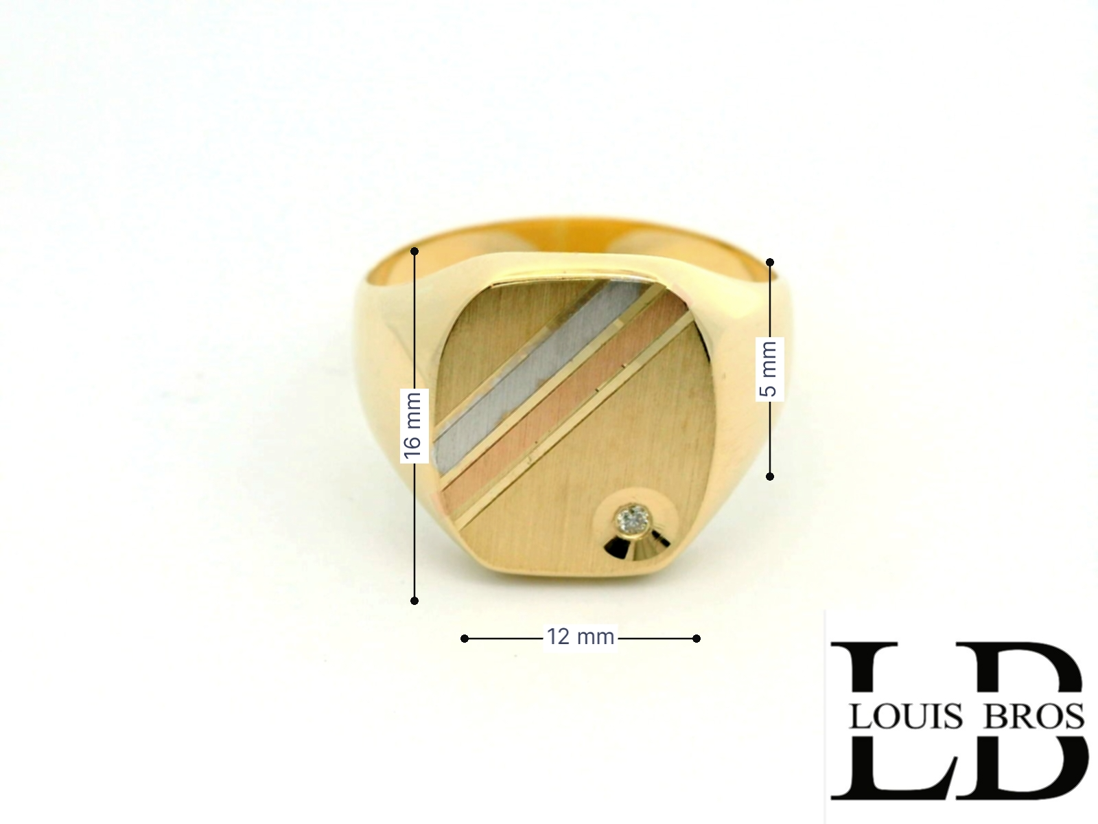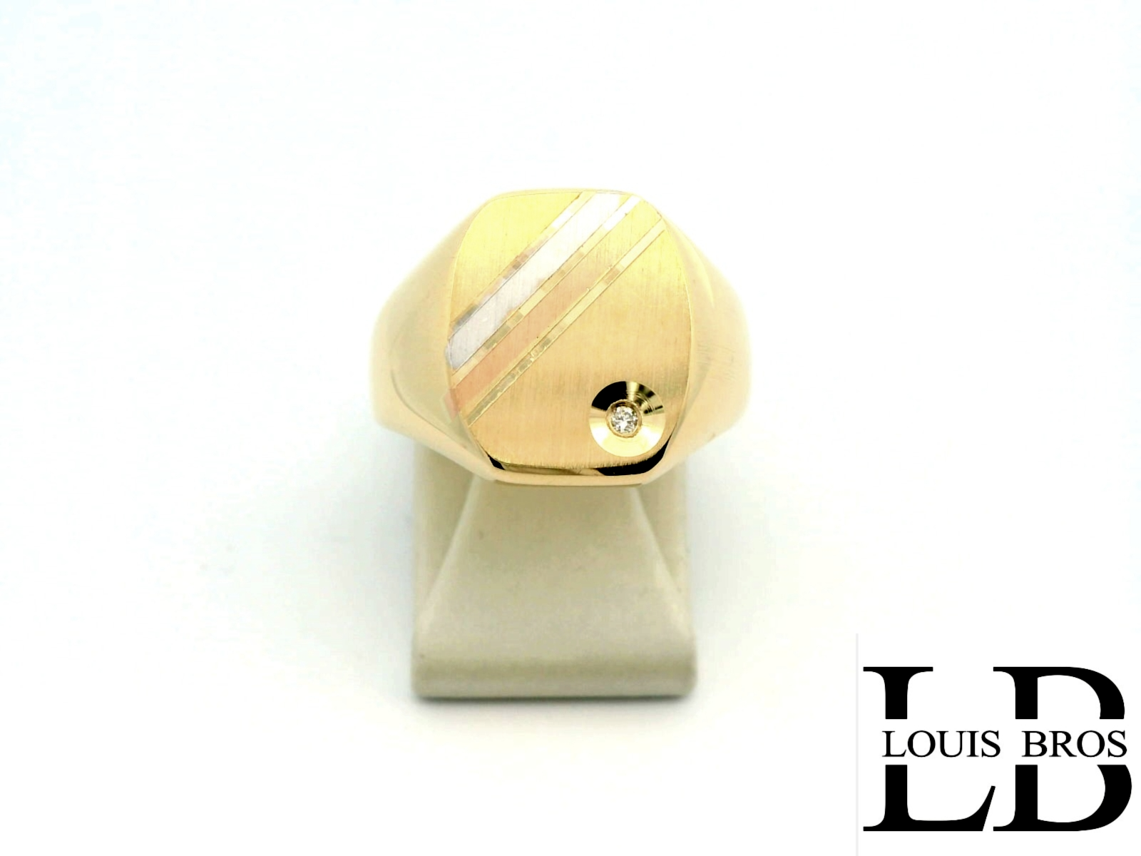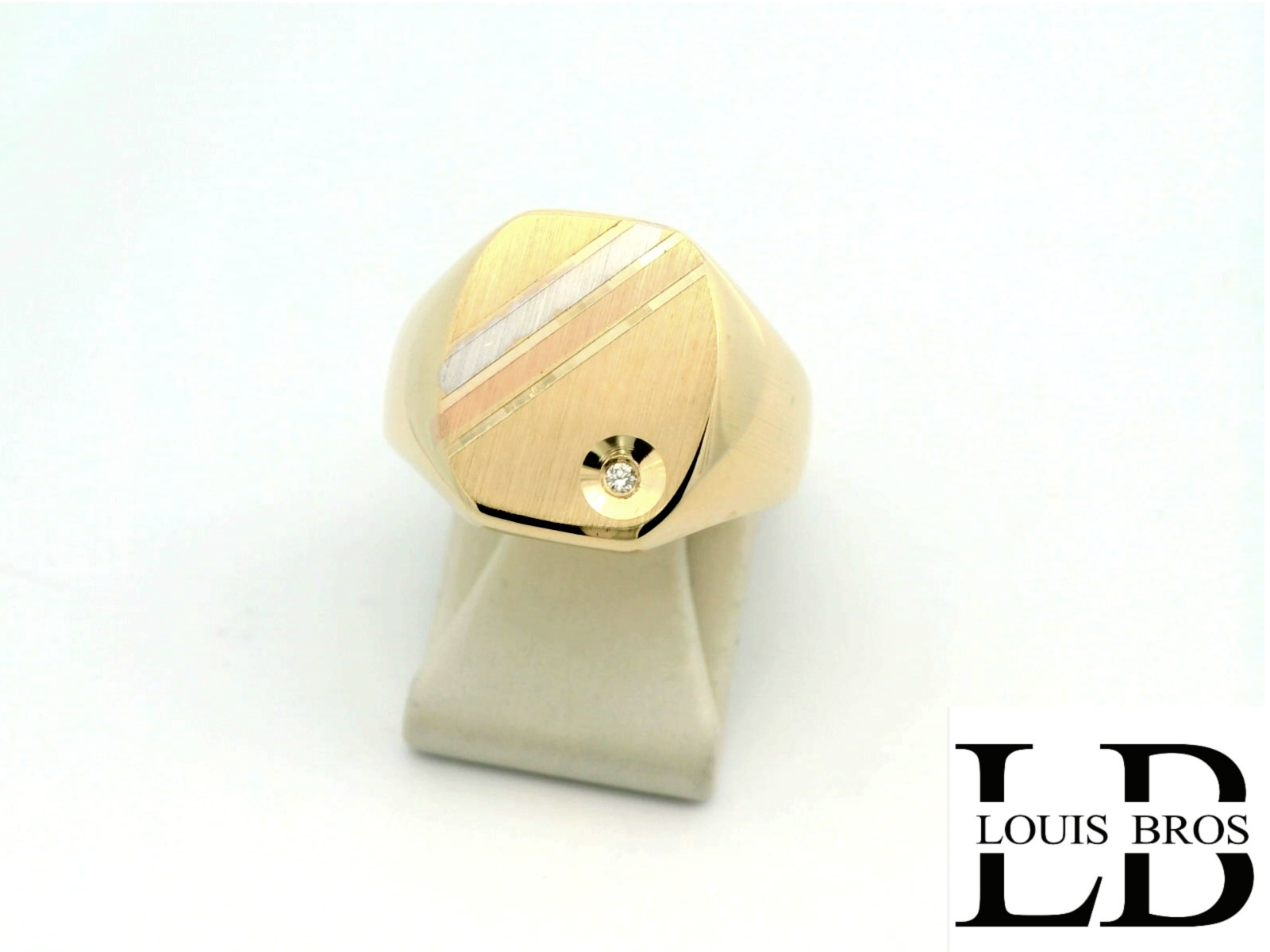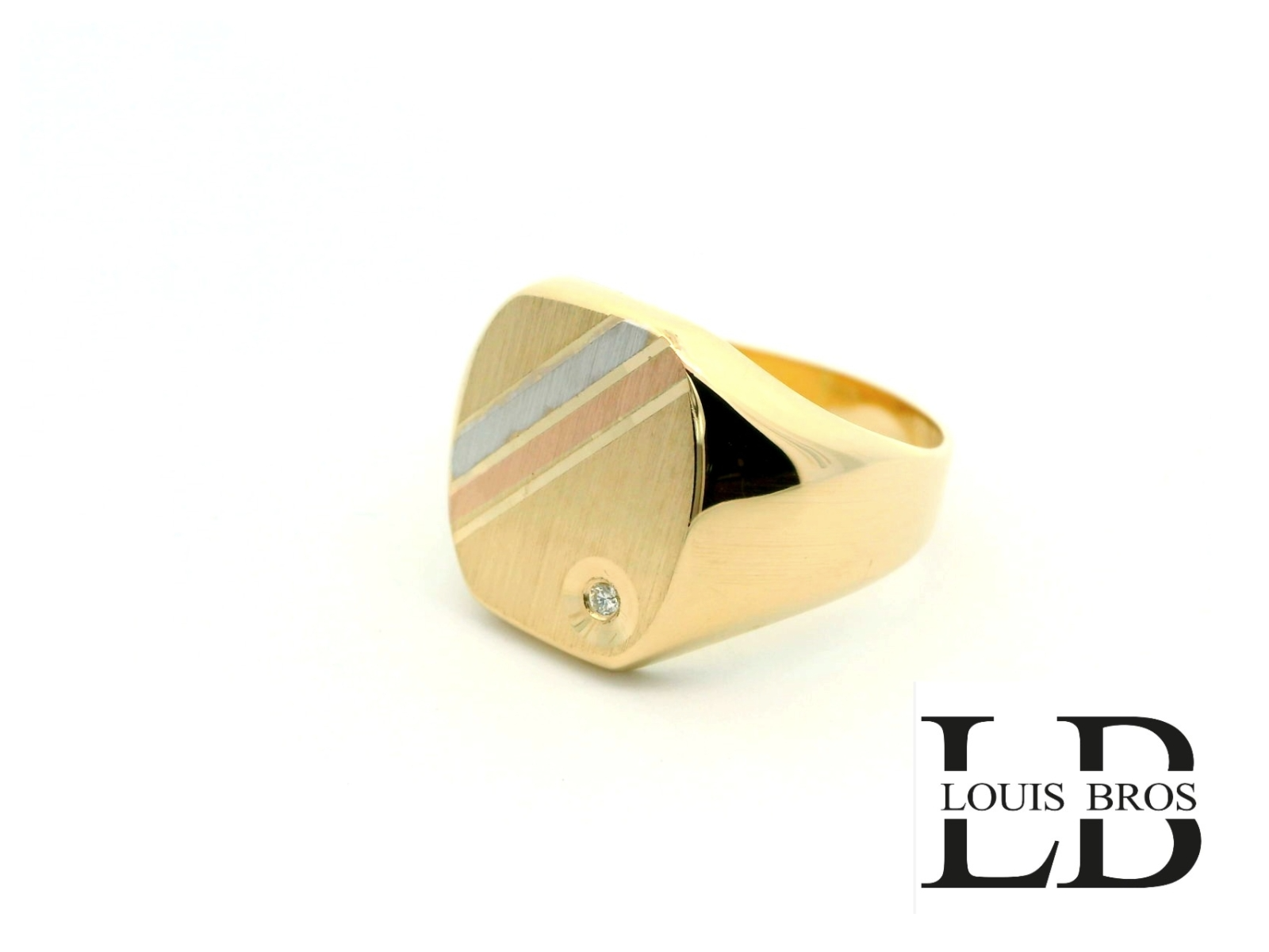 Deze elegante heren zegelring van 14 karaat goud (5.82 gr) combineert klassiek design met een verfijnd, modern accent. De mat geborstelde zegel wordt verrijkt met subtiele diagonale lijnen in tricolor goudtinten, die zorgen voor een uniek en luxueus contrast. Een fijn gezet diamantje voegt een subtiele, exclusieve schittering toe en benadrukt het hoogwaardige karakter van de ring. De harmonieuze combinatie van geel-, wit- en roségoud geeft de ring extra diepte en karakter, terwijl de solide vorm een krachtige en mannelijke uitstraling behoudt. Een tijdloze zegelring die vakmanschap en stijl perfect samenbrengt, ideaal voor dagelijks gebruik of als bijzonder statement bij formele gelegenheden.
