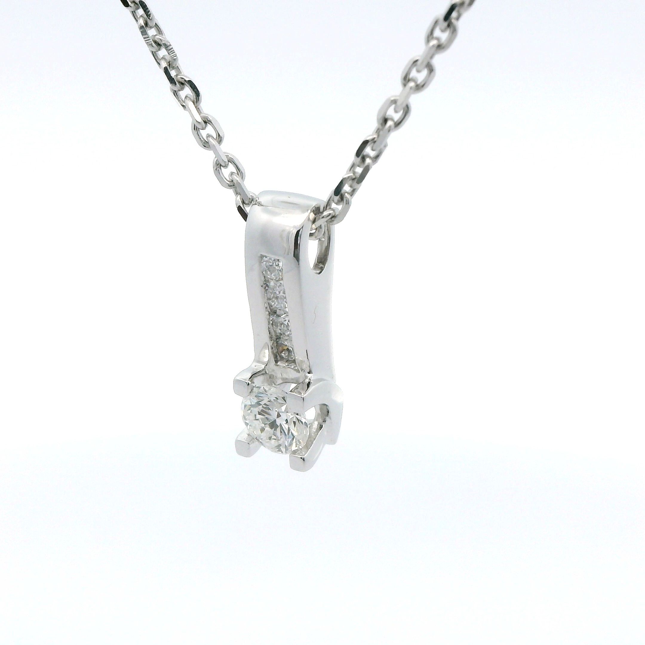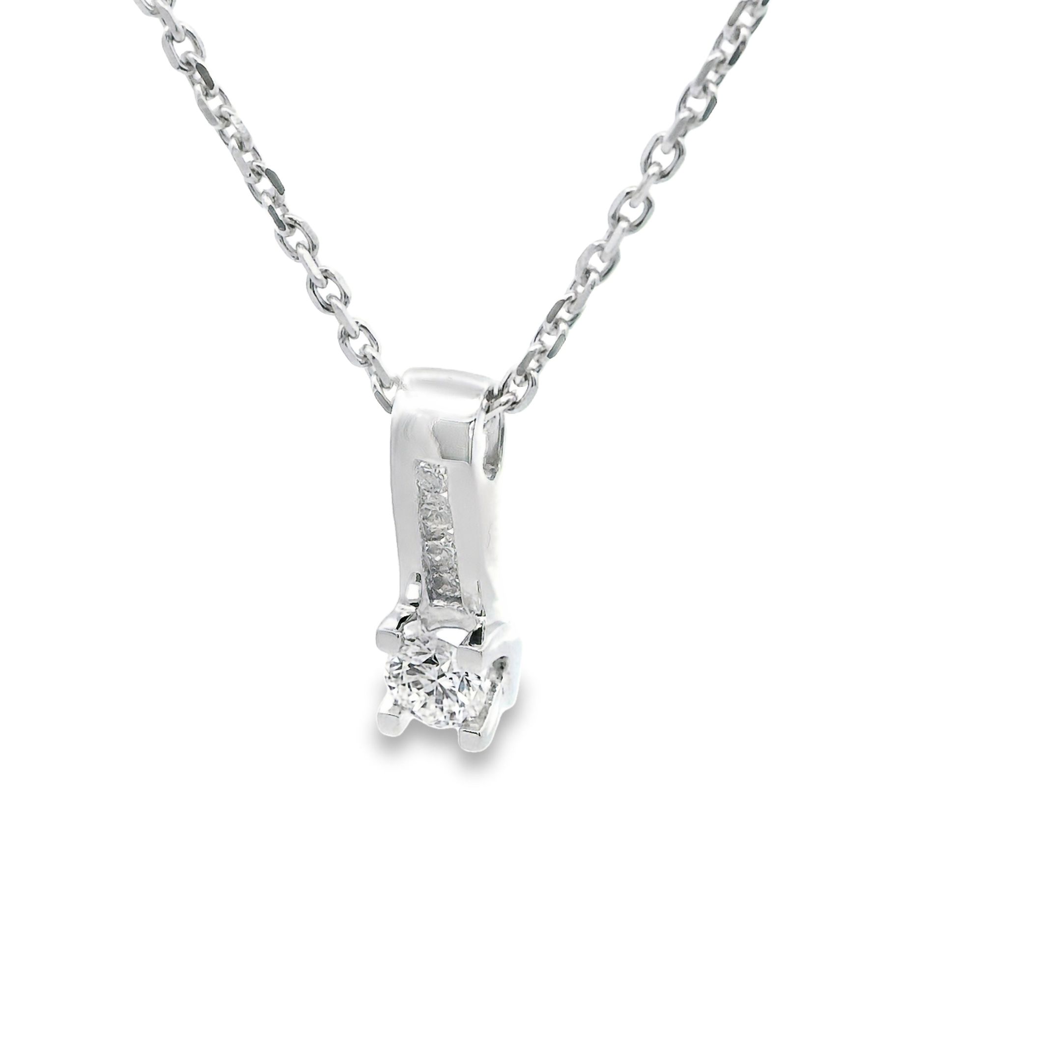 Deze hanger met collier van Louis Bros is vervaardigd uit 14 karaat witgoud (3.60gr.) en is gezet met 5 briljant geslepen diamanten met een totaalgewicht van 0.20 ct. De hanger heeft een diameter van 13 mm en een breedte van 4.5 mm. En een dikte van 3.5 mm. Deze hanger straalt tijdloze elegantie uit. Het witgoud geeft de hanger een moderne en verfijnde uitstraling, terwijl de solitaire diamant het middelpunt van de aandacht vormt. De diamant schittert prachtig en staat symbool voor liefde en schoonheid. Of je deze hanger nu draagt voor een speciale gelegenheid of als een dagelijks sieraad, het zal zeker de aandacht trekken en je laten stralen. Het is een prachtig symbool van jouw unieke stijl en persoonlijkheid.