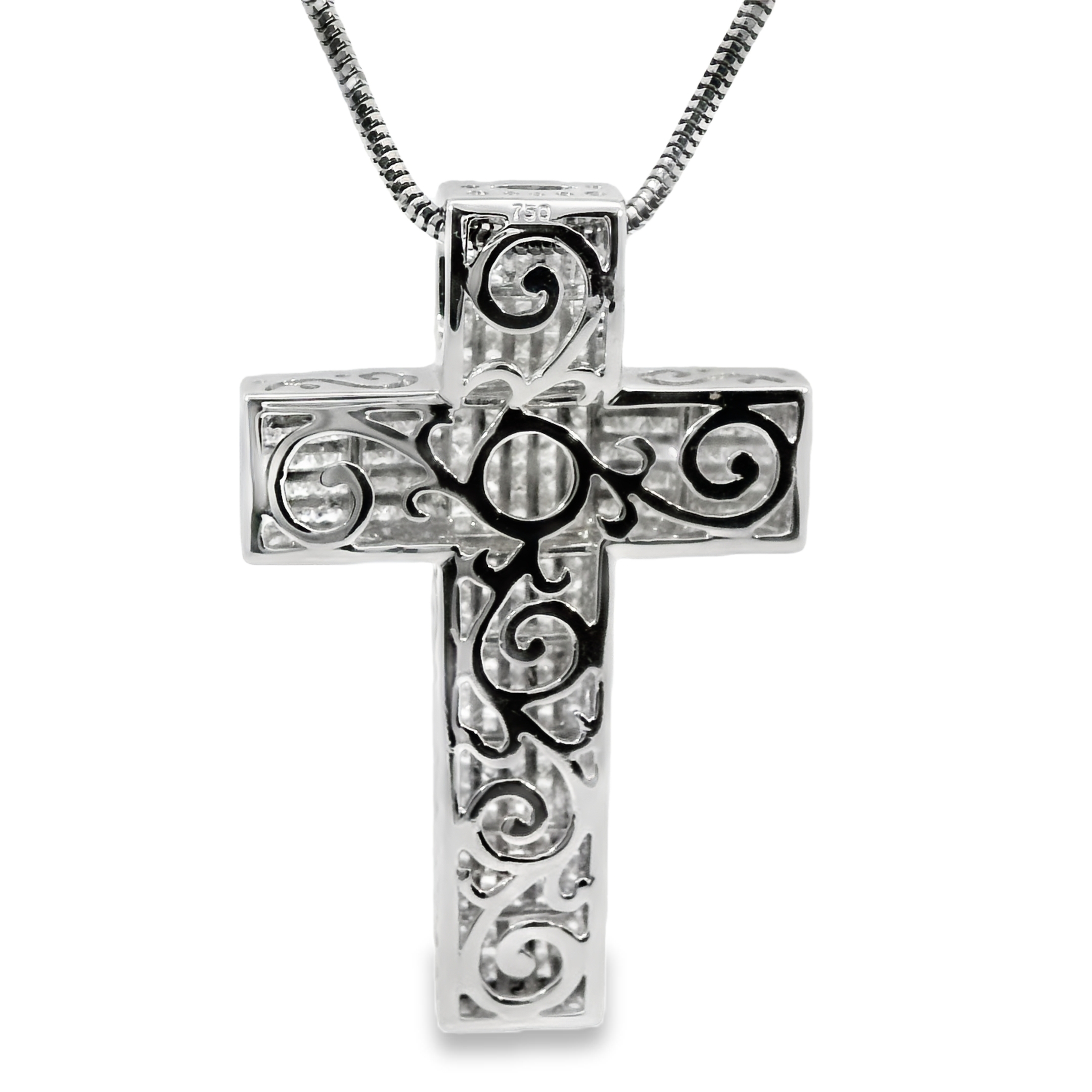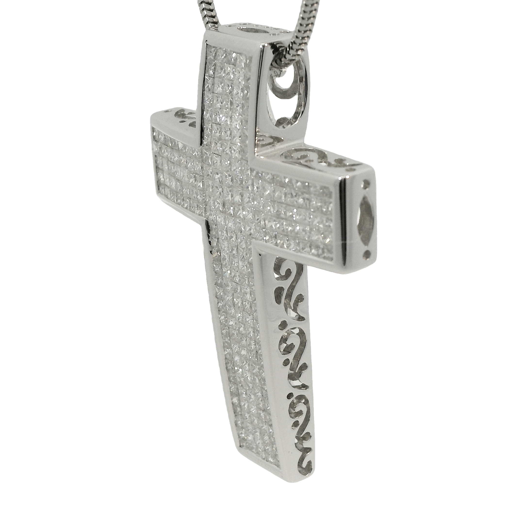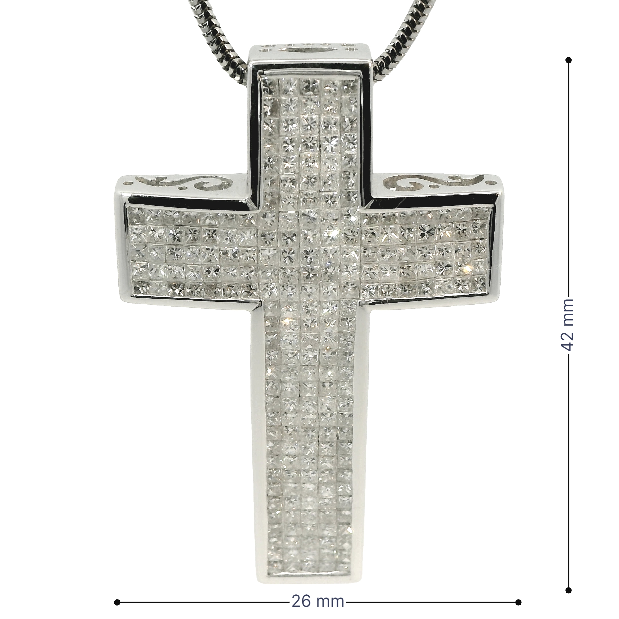 Dit schitterende witgouden kruis is een waar statementstuk, bezet met fonkelende princess geslepen diamanten die het ontwerp een moderne en luxe uitstraling geven. De strakke lijnen van de princess diamanten versterken de elegantie en symmetrie van het kruis, terwijl de koele glans van het witgoud een tijdloze verfijning toevoegt. Dit opvallende sieraad combineert klassieke symboliek met eigentijdse pracht, perfect voor wie houdt van een uitgesproken en verfijnde look.