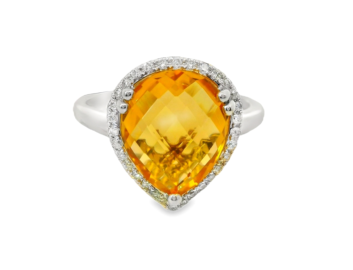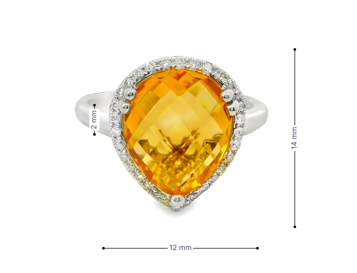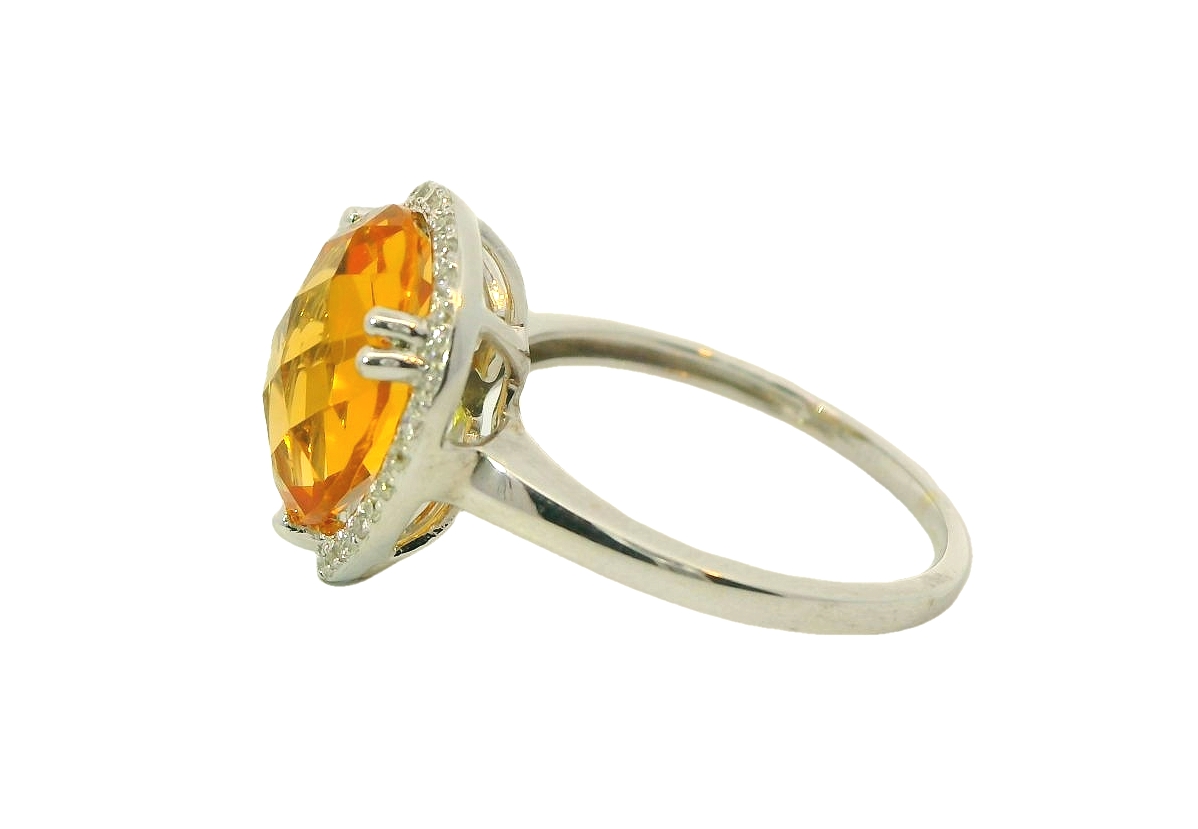 Deze ring van Louis Bros is vervaardigd uit 14 karaat witgoud (3.04 gr.) en is gezet met 32 briljant geslepen diamanten met een totaalgewicht van 0.11ct en 1 citrien 3.00 ct.