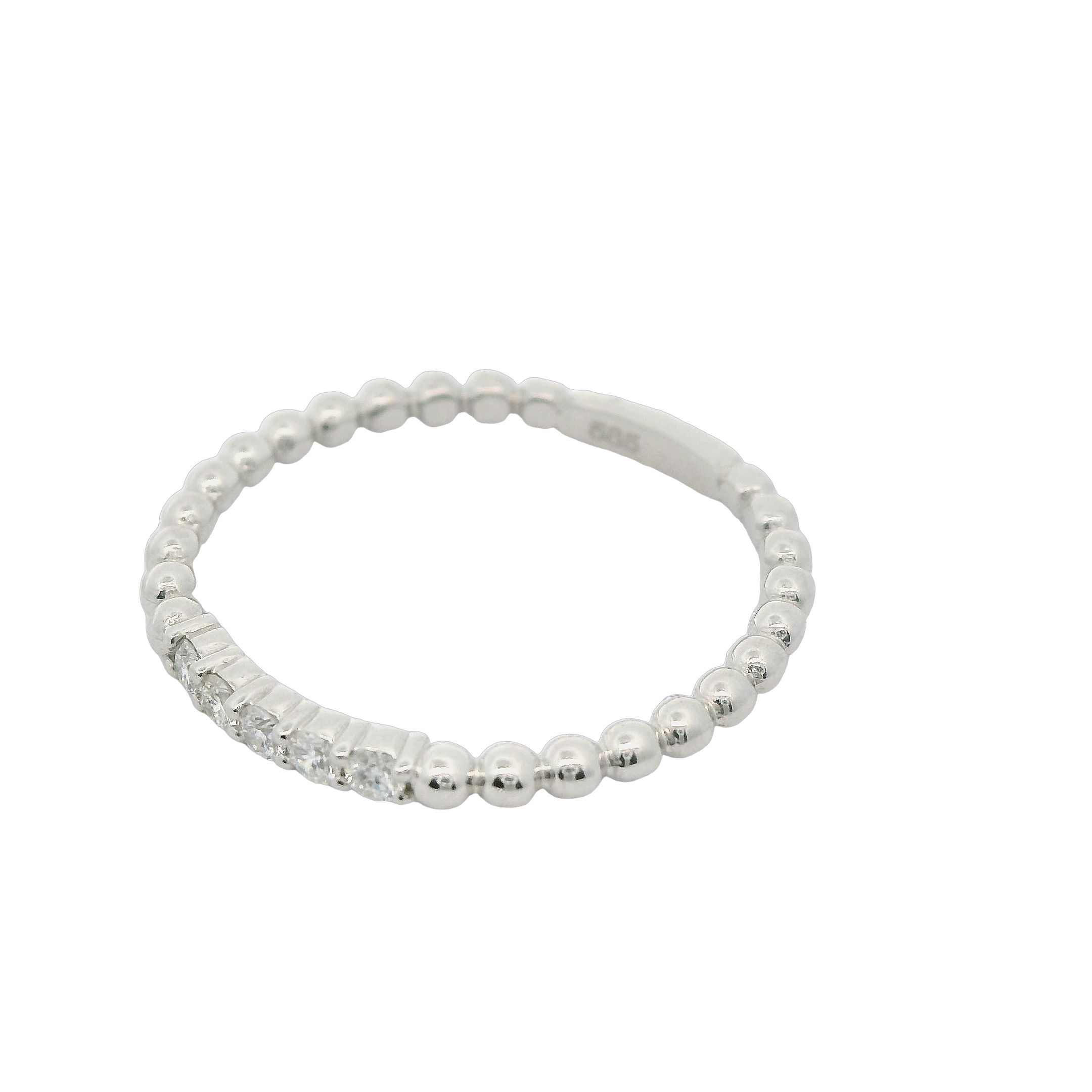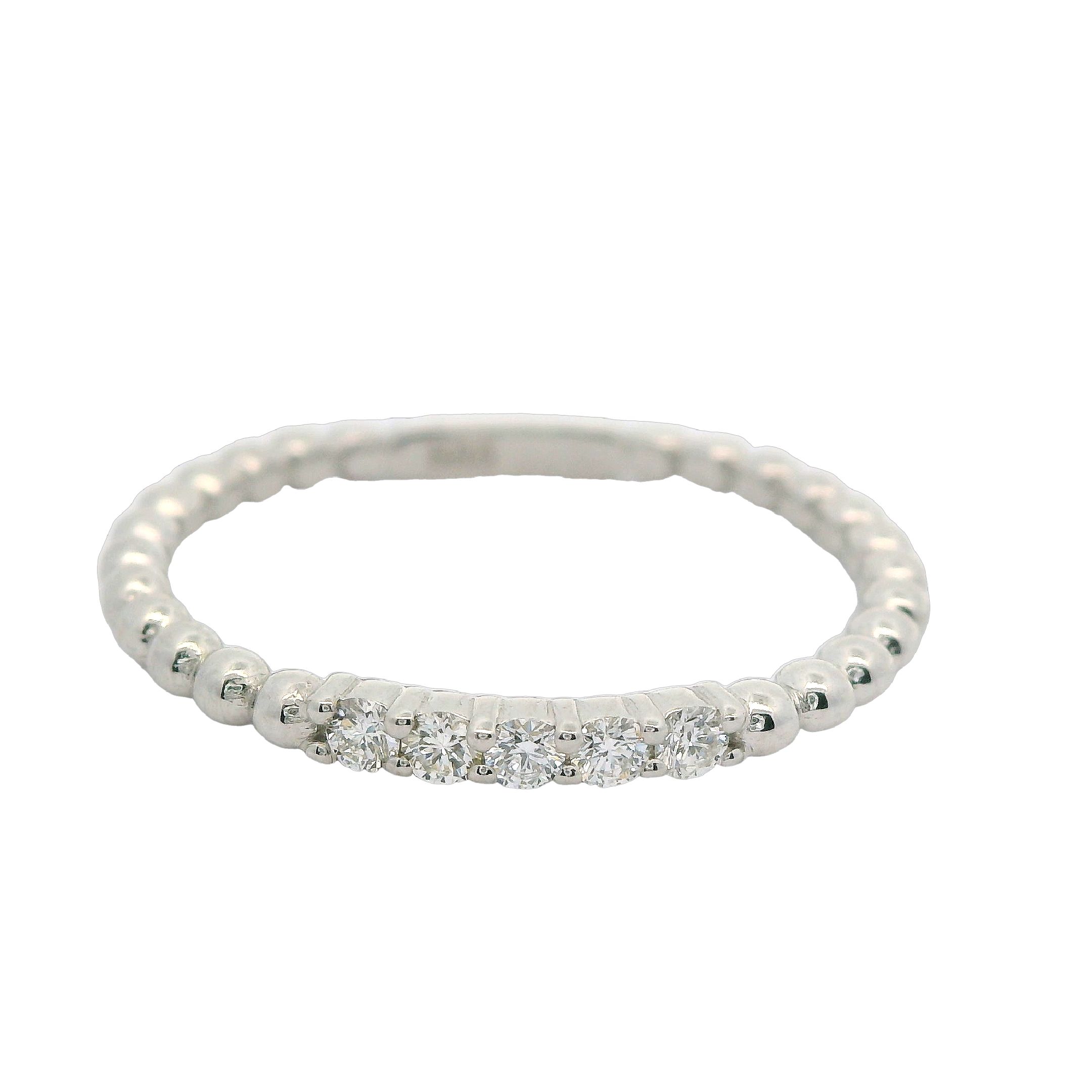 Deze ring van Louis Bros is vervaardigd uit 14 karaat witgoud (1.32 gr.) en is gezet met 5 briljant geslepen diamanten met een totaalgewicht van 0.07ct. De ring heeft een breedte van 1.5 mm, en een dikte van 1.5 mm. Deze ring bestaat uit onze lijn van exclusieve modellen sieraden met prachtige designs van hoge kwaliteit.