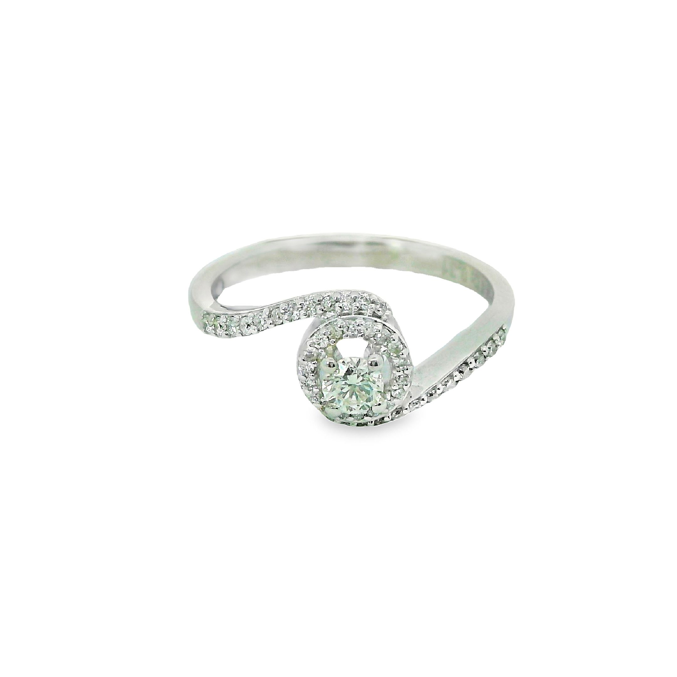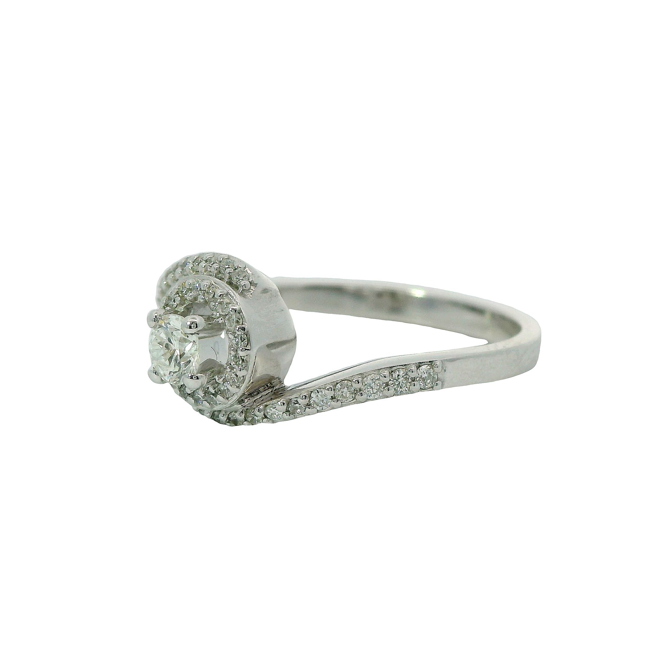 Stap binnen in de wereld van tijdloze elegantie en verfijning met deze betoverende witgouden ring, waarin een stralende diamant schittert te midden van een fantasievol design. Deze ring is niet slechts een sieraad, maar een kunstwerk dat de verbeelding prikkelt en de schoonheid van de drager accentueert.