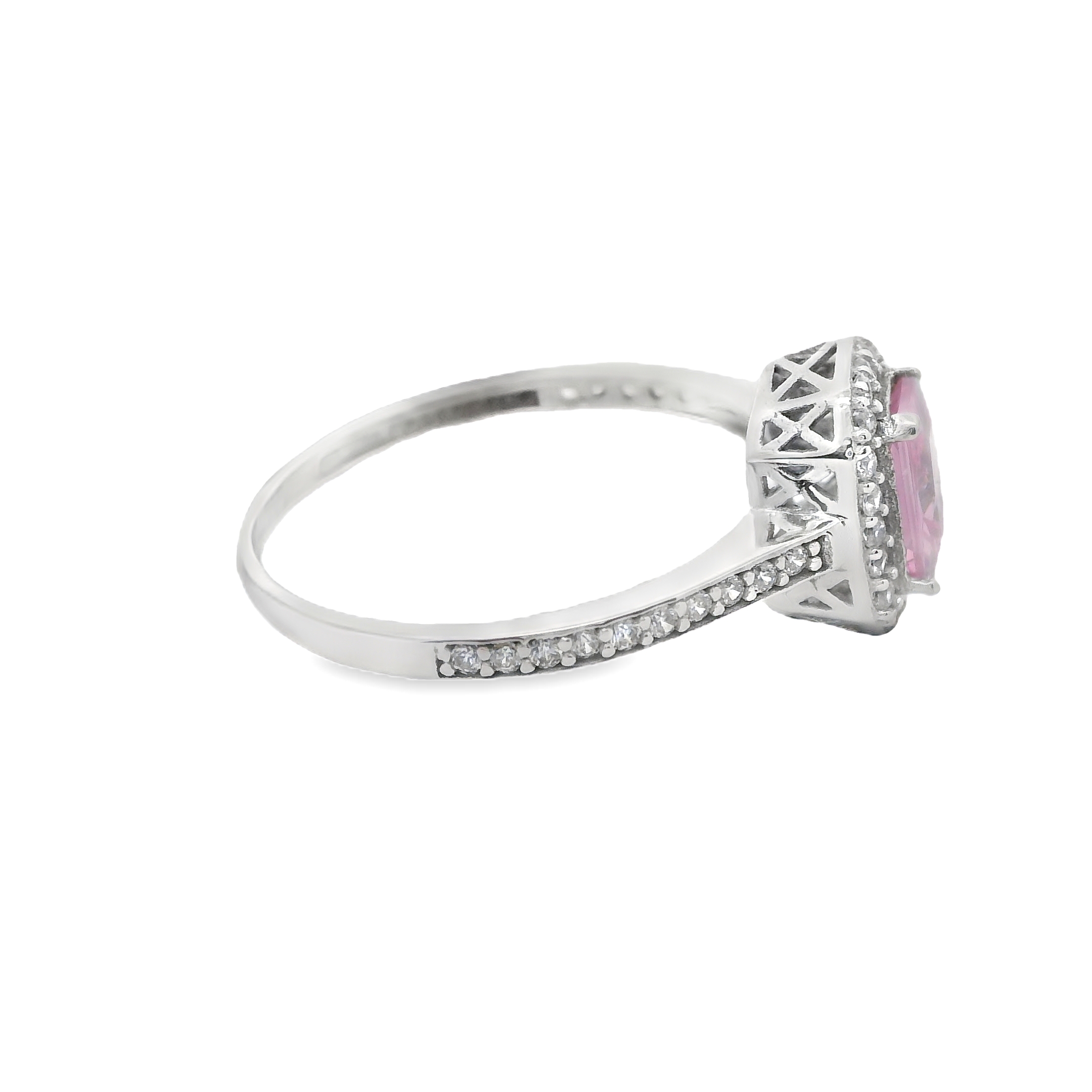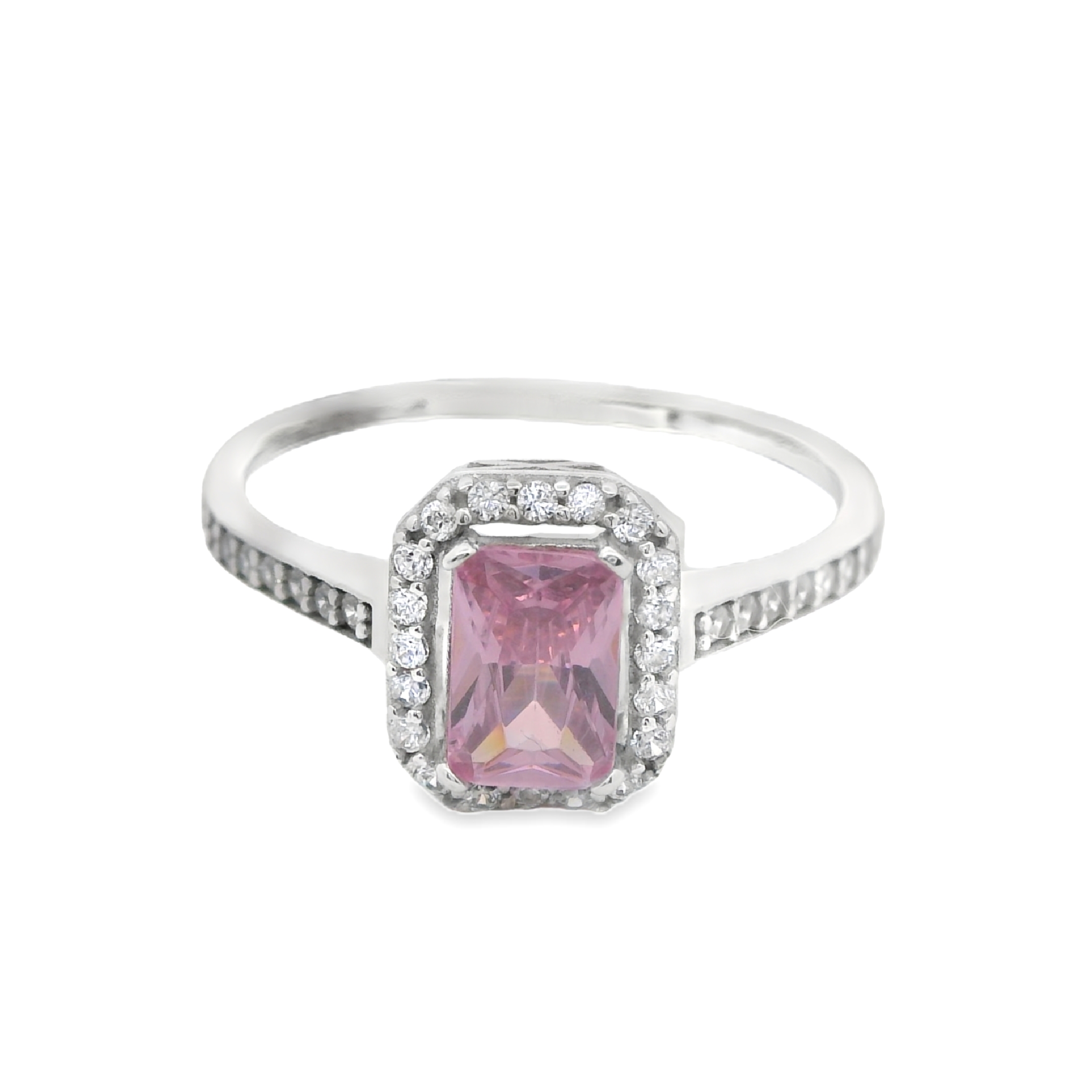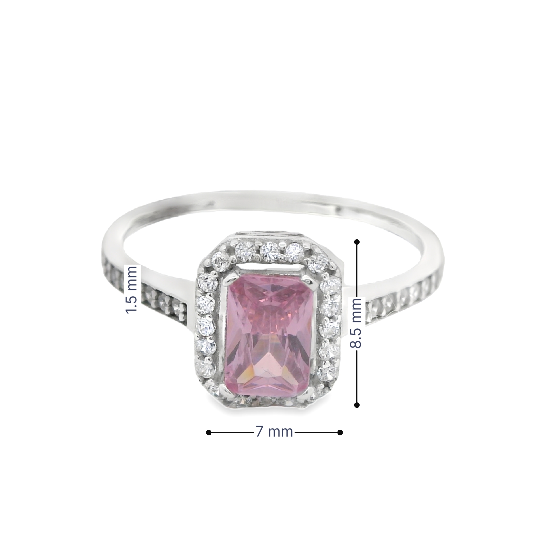 Deze ring met een roze zirkonia in het midden en omringd door witte zirkonia is een opvallend en verfijnd sieraad. Het koele witgoud benadrukt de zachte roze kleur van de centrale zirkonia, terwijl de omliggende witte zirkonia's extra schittering toevoegen. De witte zirkonia's op de band versterken de luxueuze uitstraling van deze ring. Dit sieraad combineert elegantie met een speelse touch, perfect voor wie op zoek is naar een unieke en stijlvolle ring met een vleugje romantiek.