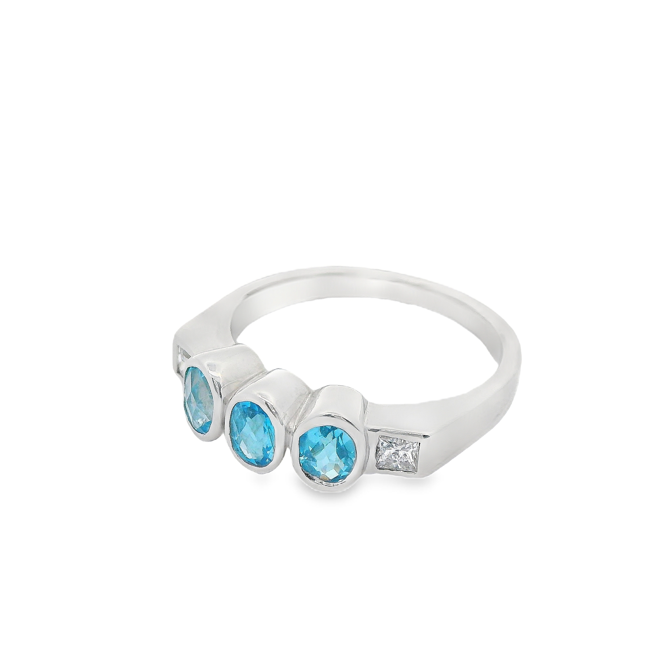 Deze ring van Louis Bros is vervaardigd uit 18 karaat witgoud (4.80.gr) en is gezet met 2 princess geslepen diamanten met een totaalgewicht van 0.10ct, en 3 blauwe topaas. De ring heeft een breedte van 6 mm. Deze ring is een schitterend en elegant sieraad. Het stralende witgoud biedt een moderne en luxueuze basis voor de ring. Centraal in het ontwerp straalt een prachtige blauwe topaas, die met zijn heldere, azuurblauwe kleur een gevoel van frisheid en sereniteit oproept. Rondom de topaas fonkelen diamanten, die de ring extra sprankeling en verfijning geven. Deze combinatie van witgoud, diamant en blauwe topaas maakt de ring perfect voor bijzondere gelegenheden en als een stijlvol cadeau. Een witgouden ring met diamant en blauwe topaas is een tijdloos juweel dat elegantie en klasse uitstraalt.