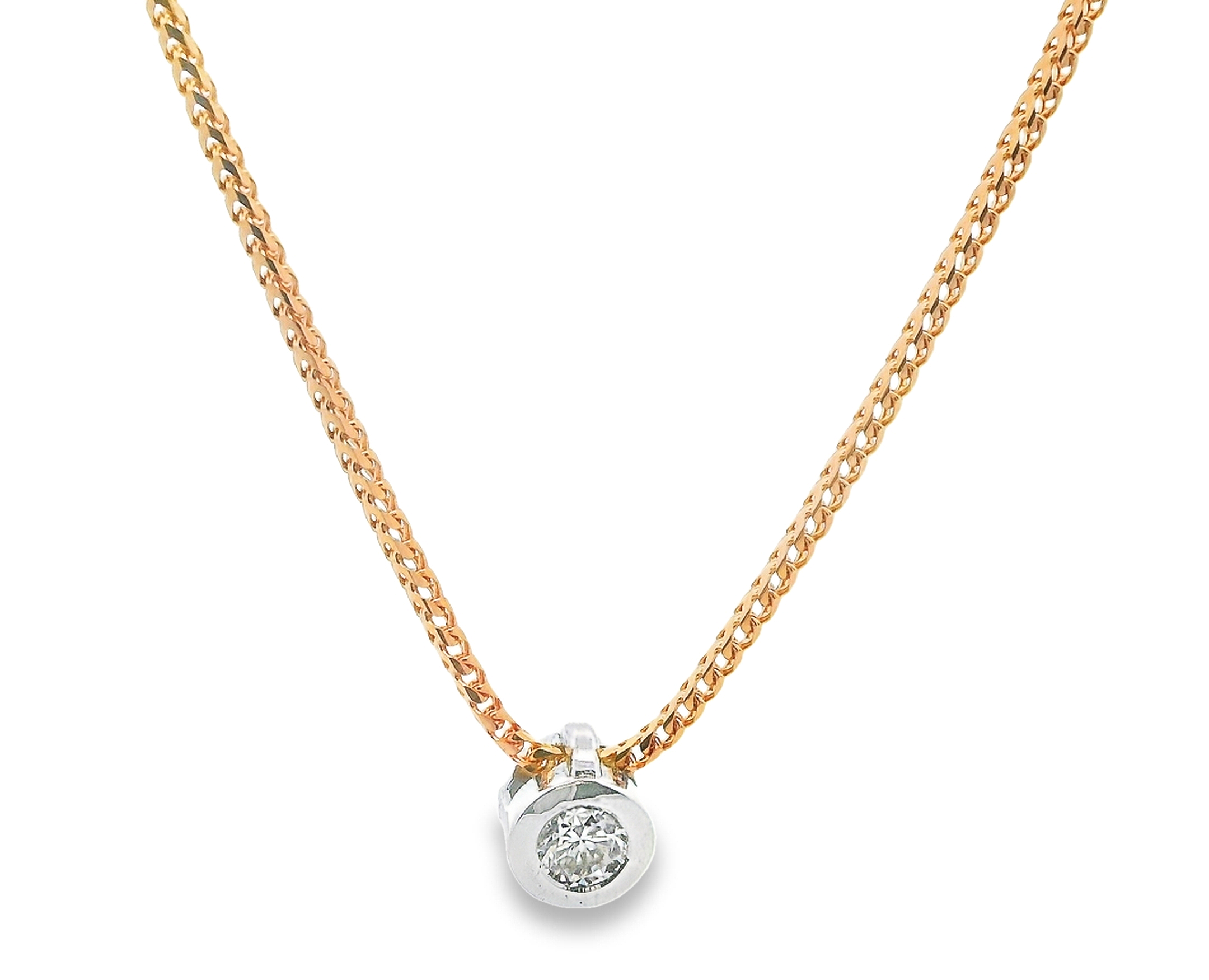 Deze hanger (met collier) van Louis Bros is vervaardigd uit 14 karaat witgoud (5 gr.) en is gezet met 1 briljant geslepen diamanten met een totaalgewicht van 0.20 ct. De hanger heeft een diameter van 5.5 mm en een dikte van 4 mm.