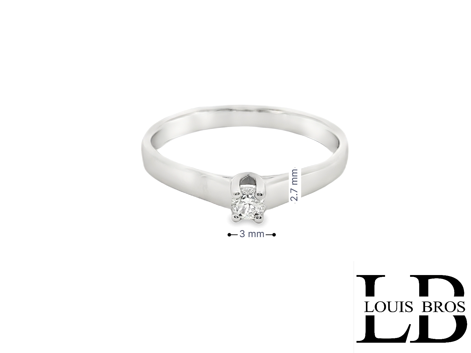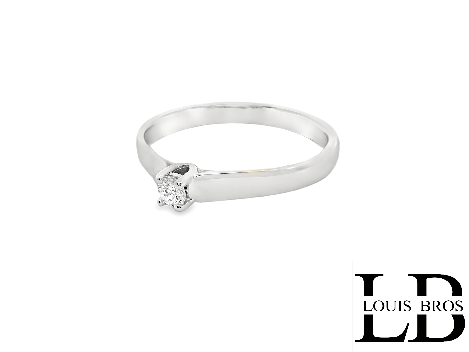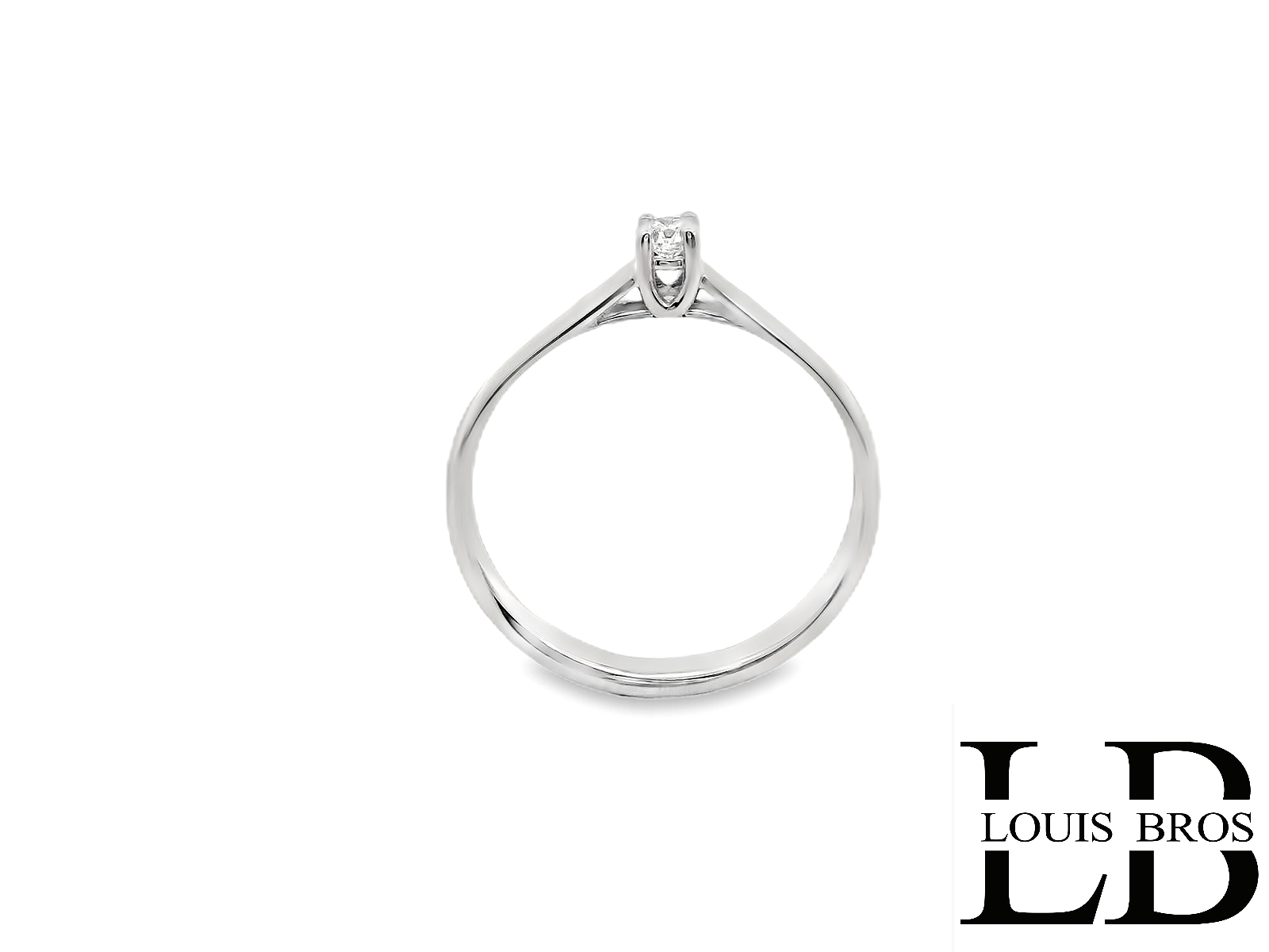 Deze elegante solitair ring is vervaardigd uit 14 karaat witgoud (2.41 gr) en straalt tijdloze klasse uit. In het midden schittert een briljant geslepen diamant van 0.08 ct (H/Si), zorgvuldig gezet om zijn natuurlijke schittering te maximaliseren.