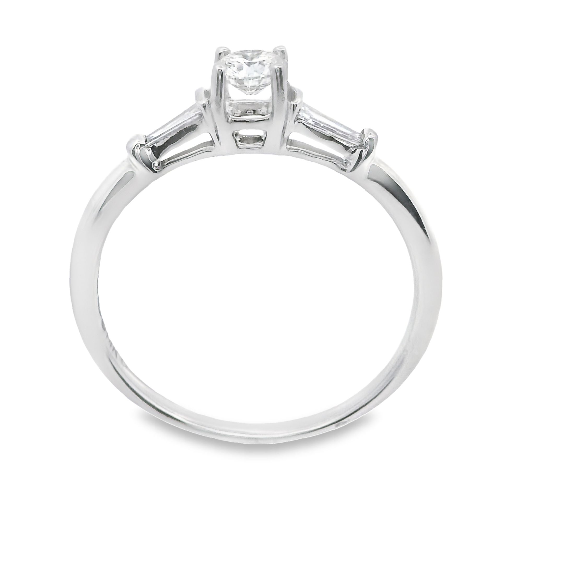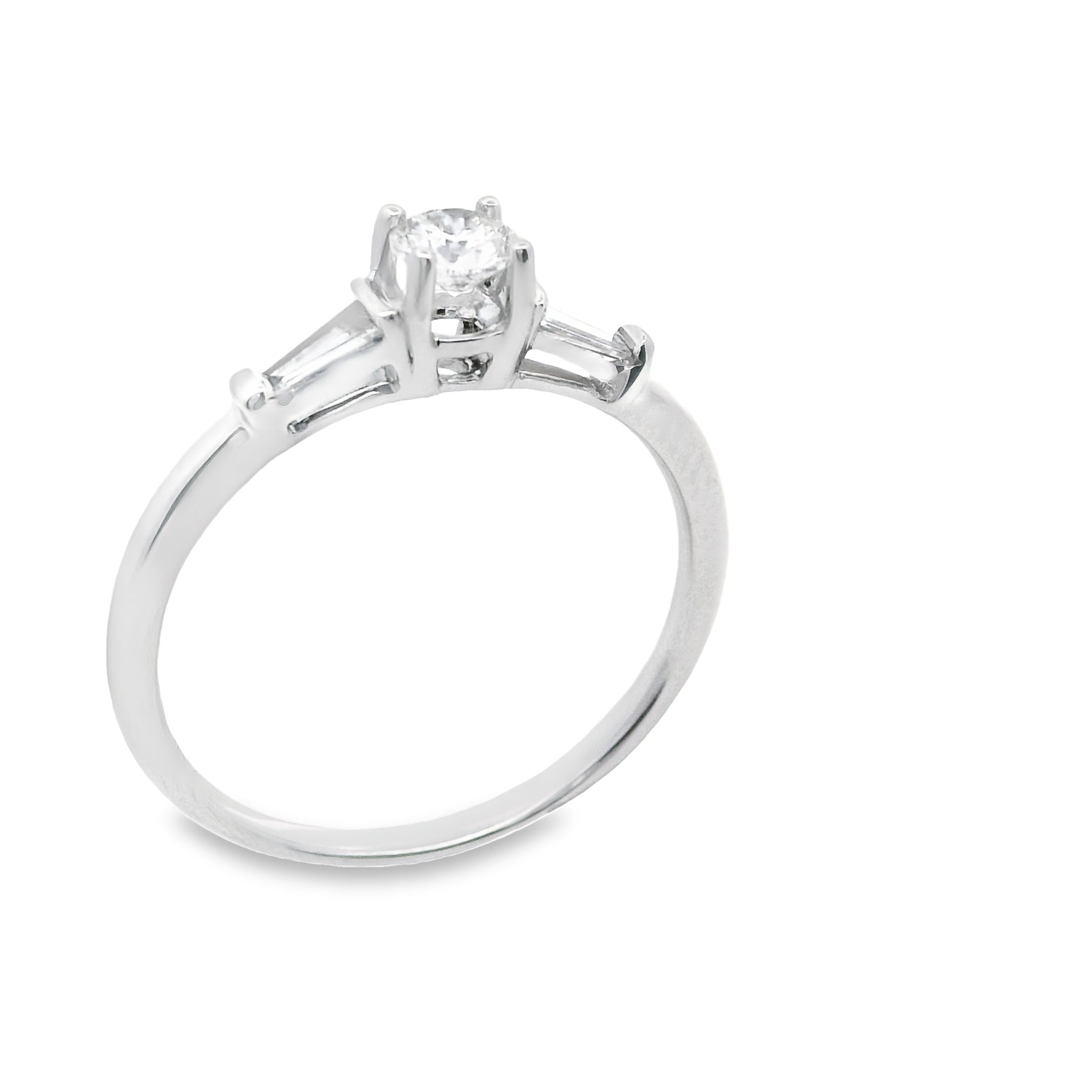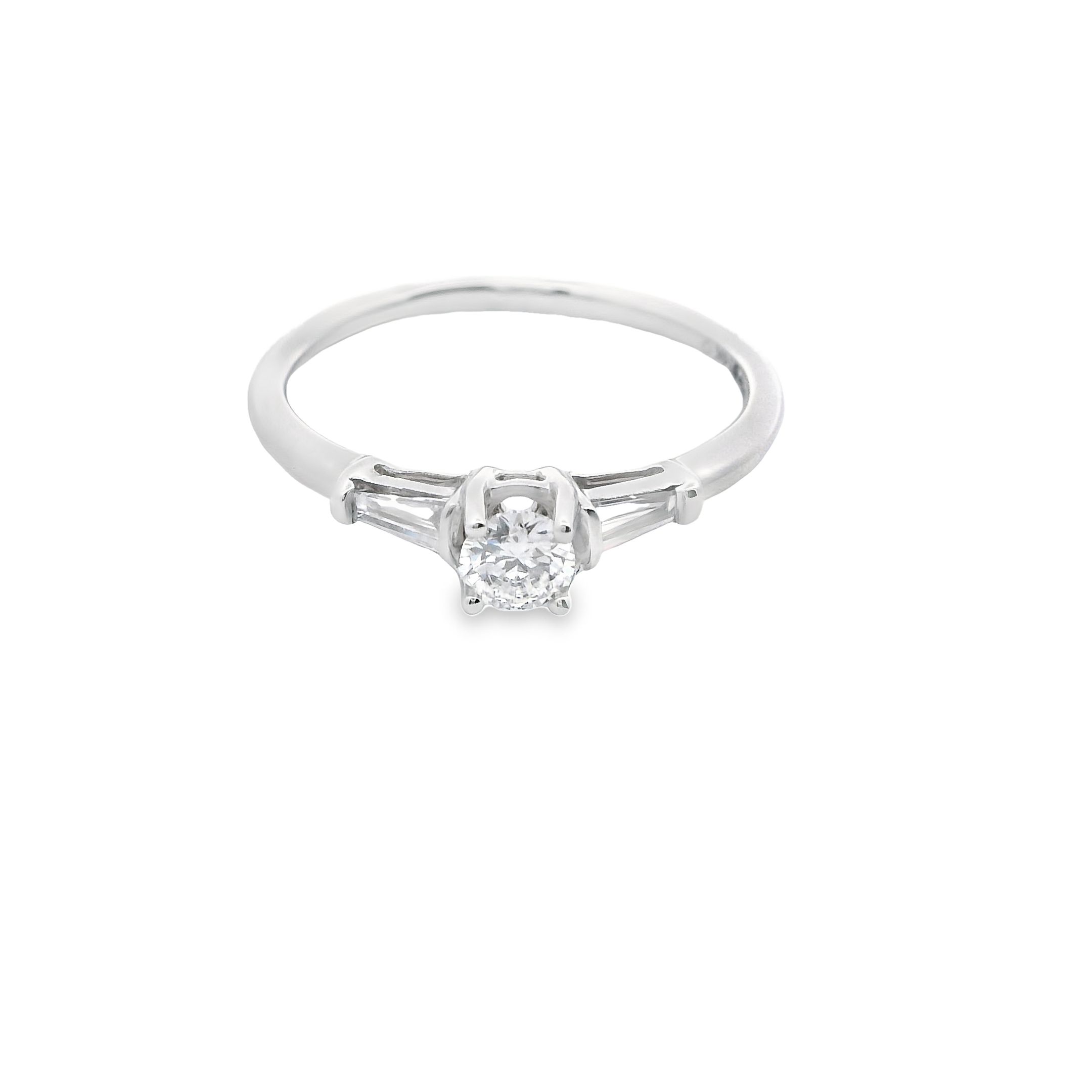 Deze exclusieve ring van Louis Bros is vervaardigd uit 14 karaat witgoud (2.13 gr.) en is gezet met 2 baguette 0.23ct en 1 briljant geslepen diamanten met een totaalgewicht van 0.15 ct. De ring heeft een diameter van 3.75 mm, minimale breedte van 2 mm. en een hoogte van 5 mm. Een witgouden solitaire ring met een diamant in het midden en twee baguette diamanten aan de zijkanten is echt adembenemend. Deze ring straalt elegantie en verfijning uit, met een tijdloos ontwerp dat de aandacht trekt. Het sprankelende middelpunt en de subtiele baguette diamanten zorgen voor een perfecte balans van glamour en stijl. Het is de ideale ring om je liefde en toewijding te symboliseren.
