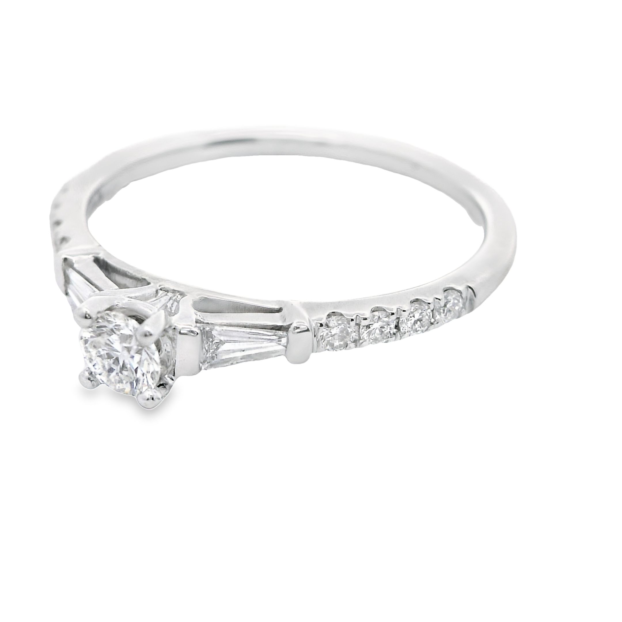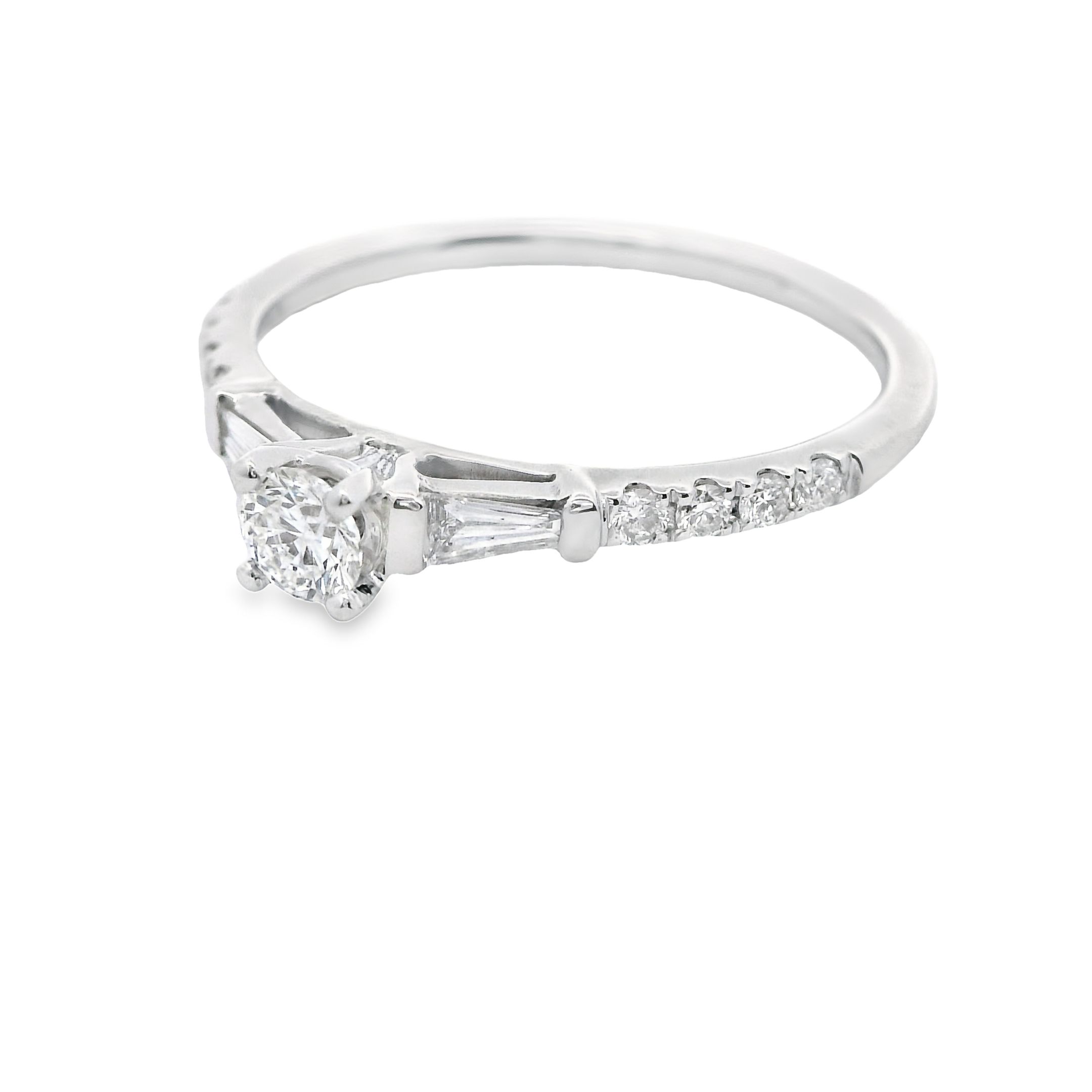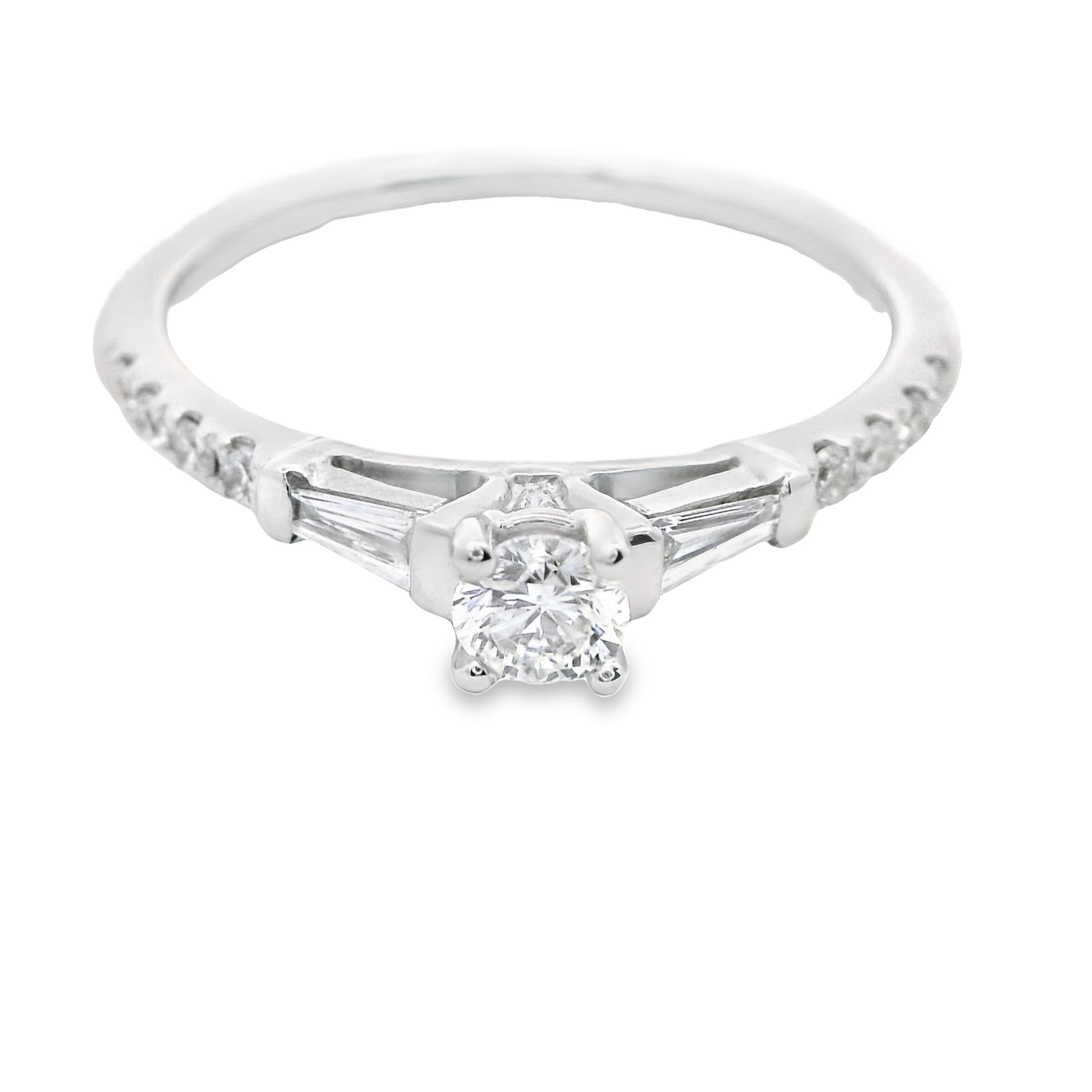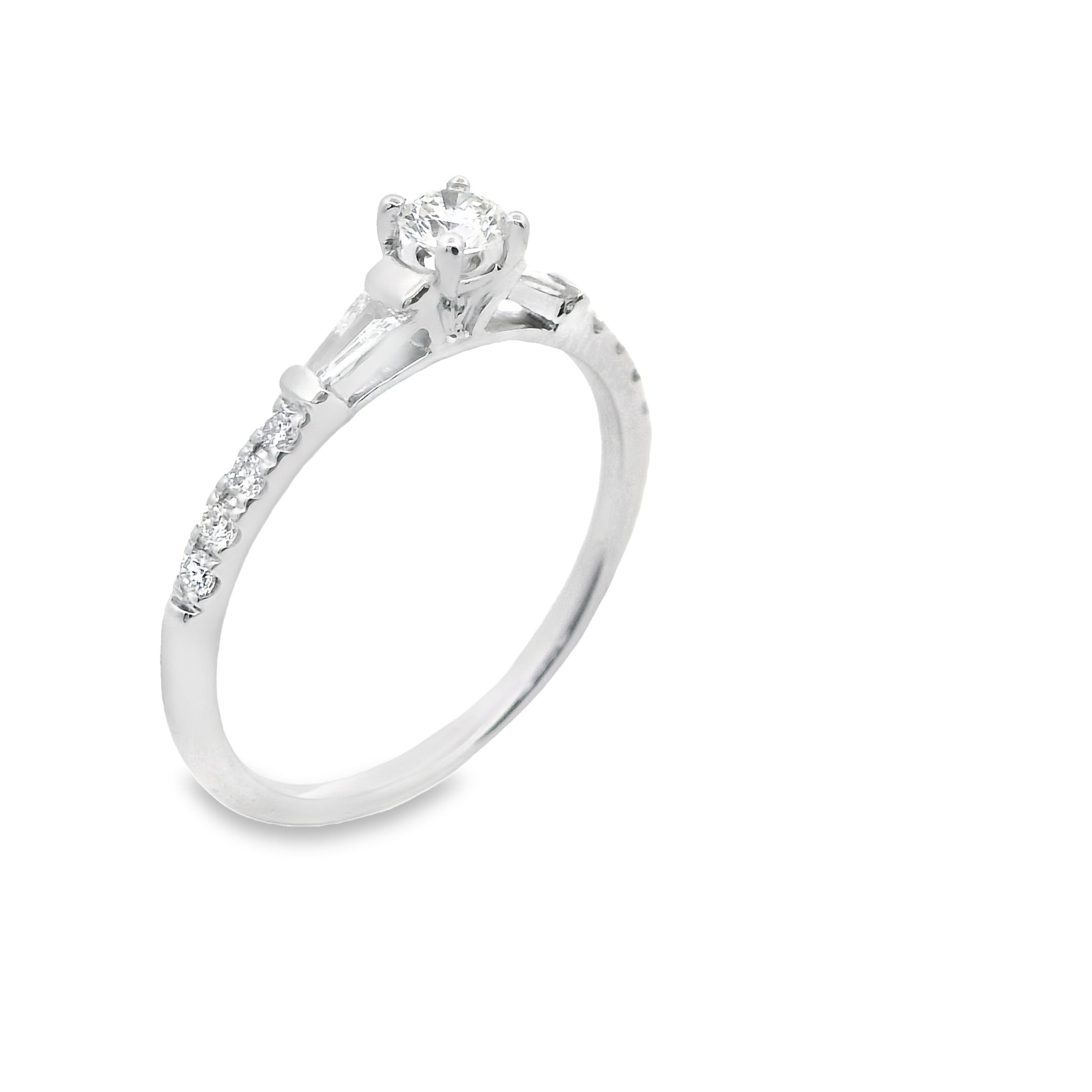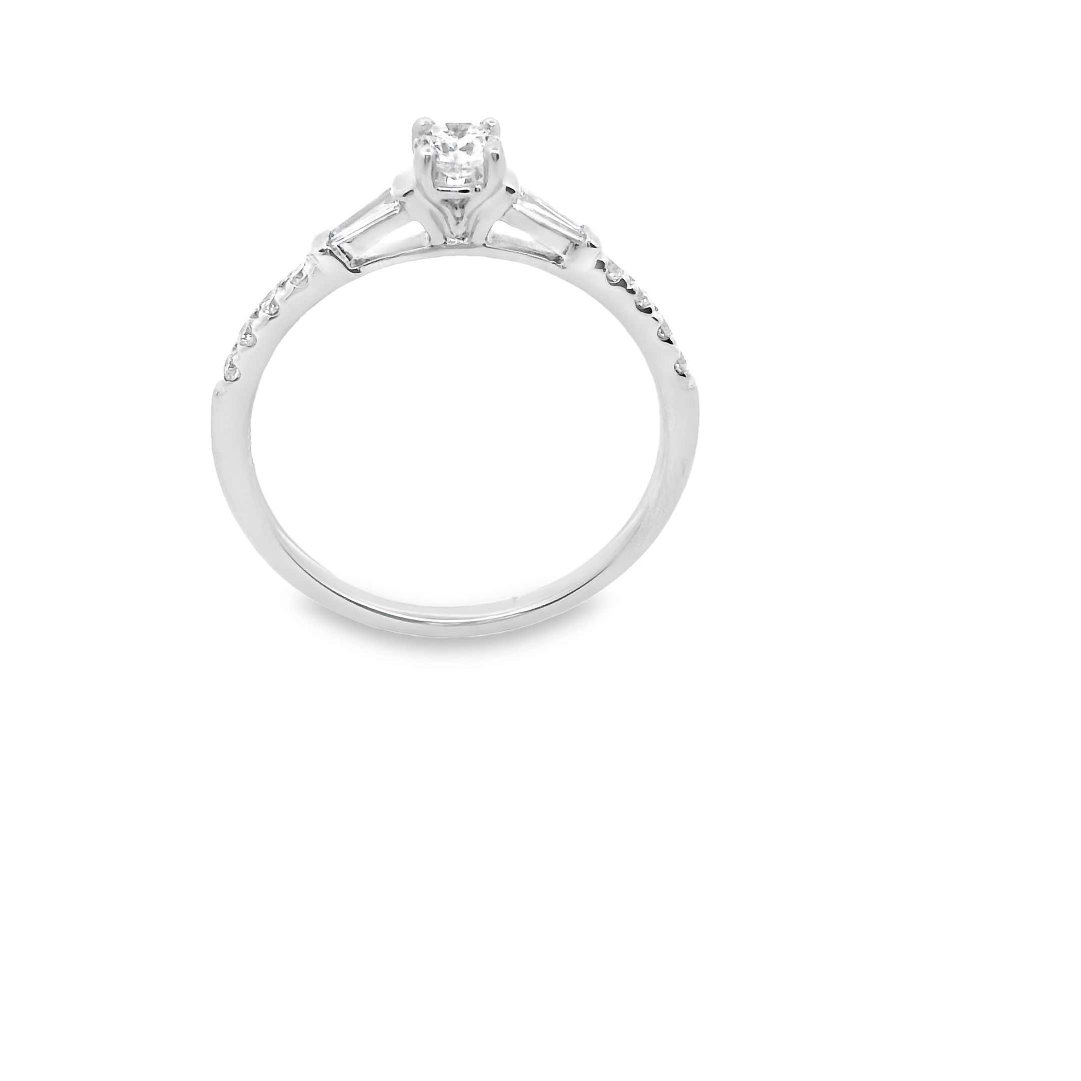 Deze exclusieve ring van Louis Bros is vervaardigd uit 14 karaat witgoud (2.18 gr.) en is gezet met 2 baguette 0.23ct en 9 briljant geslepen diamanten met een totaalgewicht van 0.27ct. De ring heeft een diameter van 3.5 mm, minimale breedte van 1.7 mm. en een hoogte van 5.5 mm. Een witgouden solitaire ring met een diamant in het midden en twee baguette diamanten aan de zijkanten is echt adembenemend. Deze ring straalt elegantie en verfijning uit, met een tijdloos ontwerp dat de aandacht trekt. Het sprankelende middelpunt en de subtiele baguette diamanten zorgen voor een perfecte balans van glamour en stijl. Het is de ideale ring om je liefde en toewijding te symboliseren.