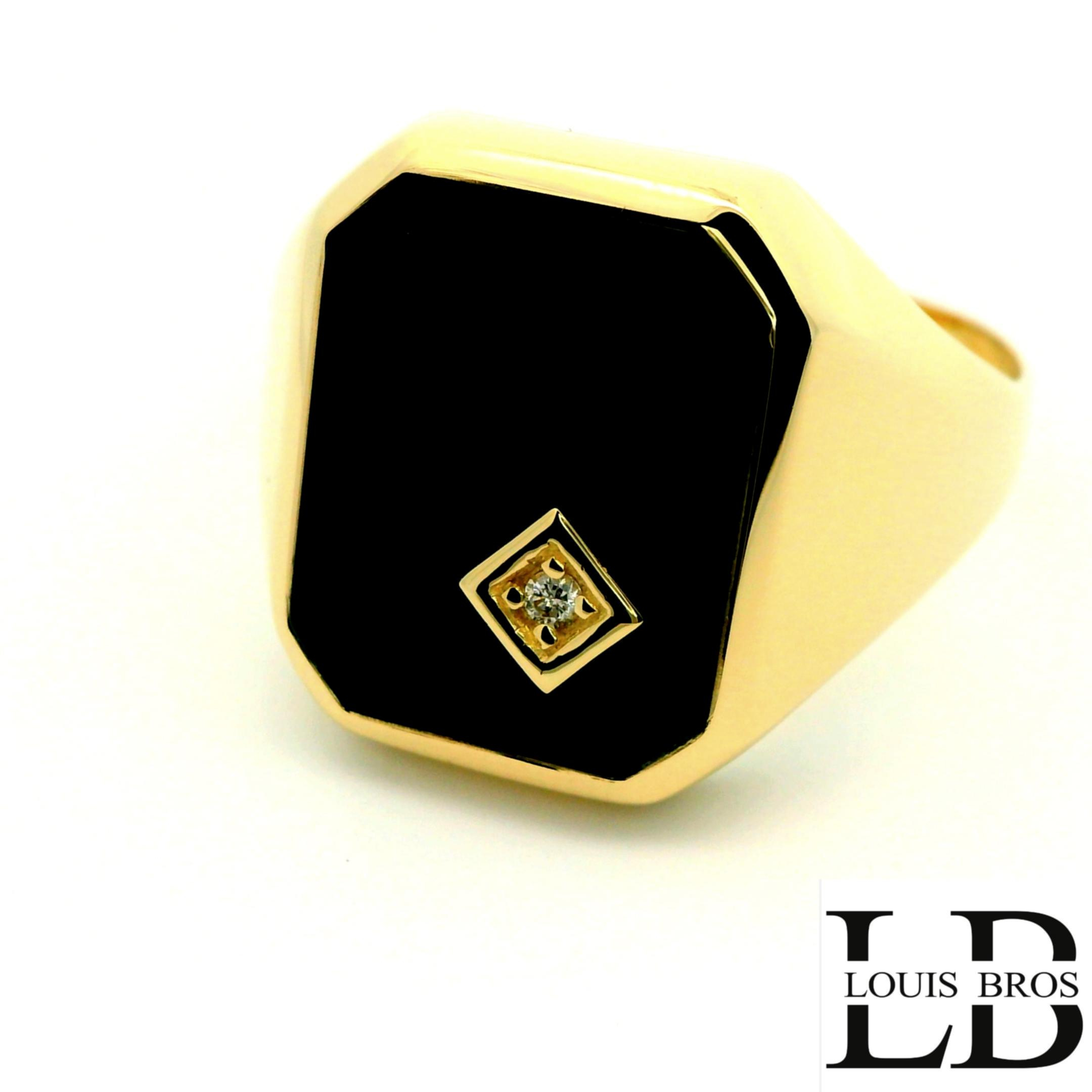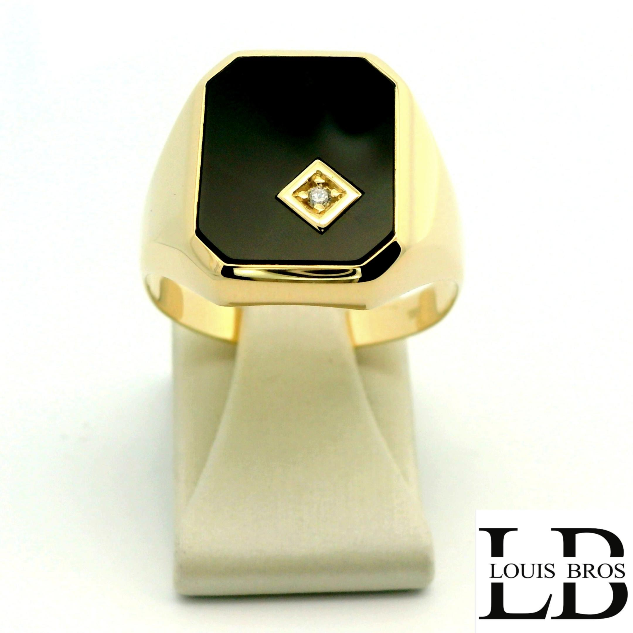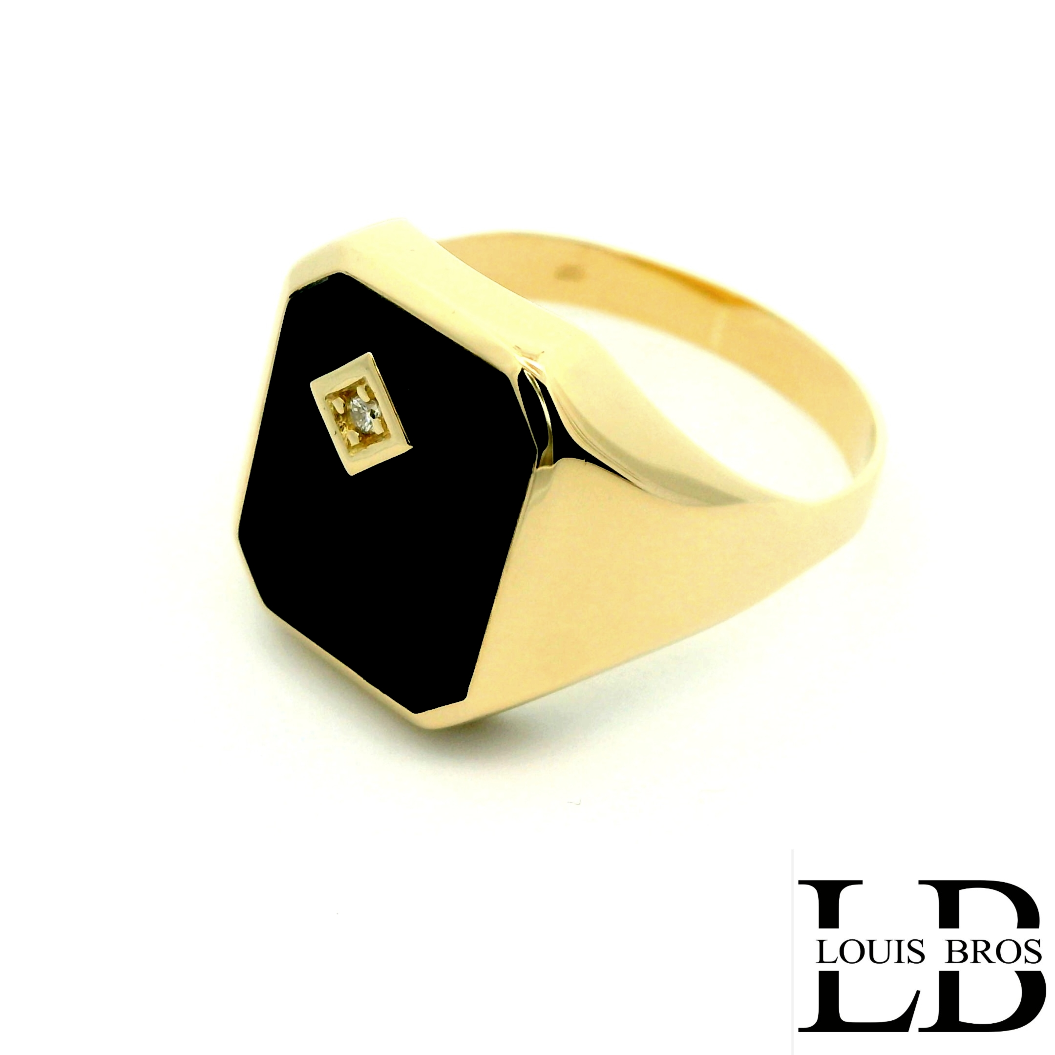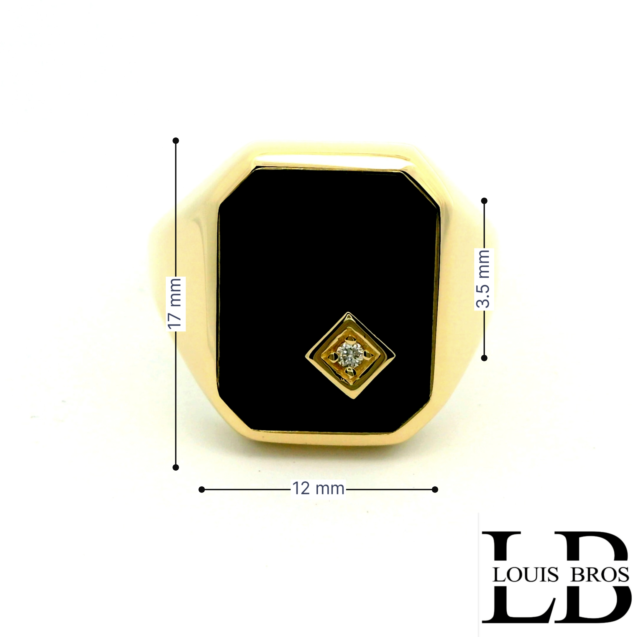 Deze heren zegelring van 14 karaat geelgoud (5.36 gr) straalt klasse en karakter uit. De ring is voorzien van een diepe, zwarte onyx die zorgt voor een krachtig en tijdloos contrast met het warme goud. Een subtiel gezet diamantje voegt een verfijnde schittering toe en geeft het ontwerp een luxueus accent, zonder afbreuk te doen aan het robuuste karakter van de ring. Dankzij het klassieke design en de solide vormgeving is deze zegelring perfect geschikt voor dagelijks gebruik én formele gelegenheden. Een elegante ring voor de man die houdt van traditie, vakmanschap en verfijnde details.