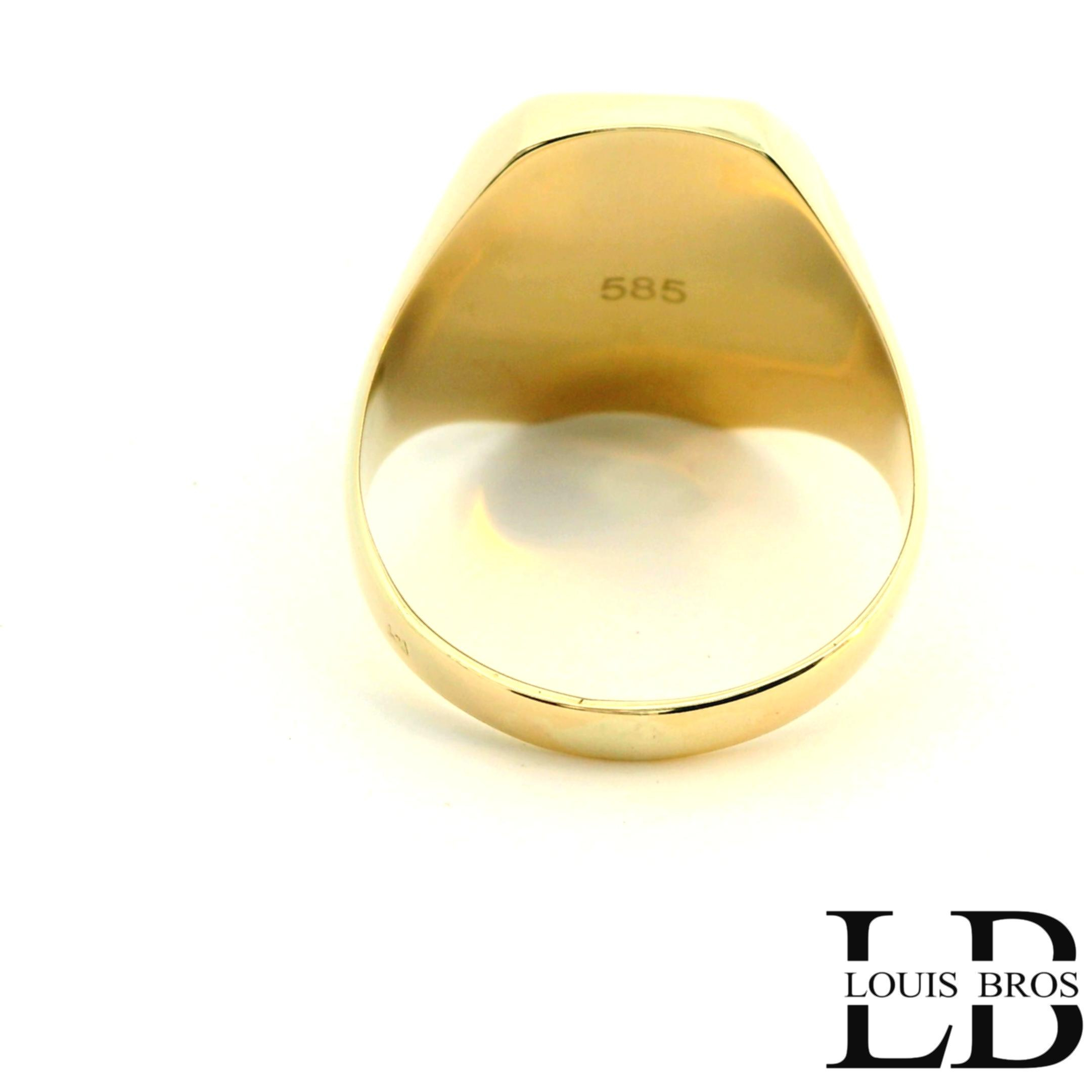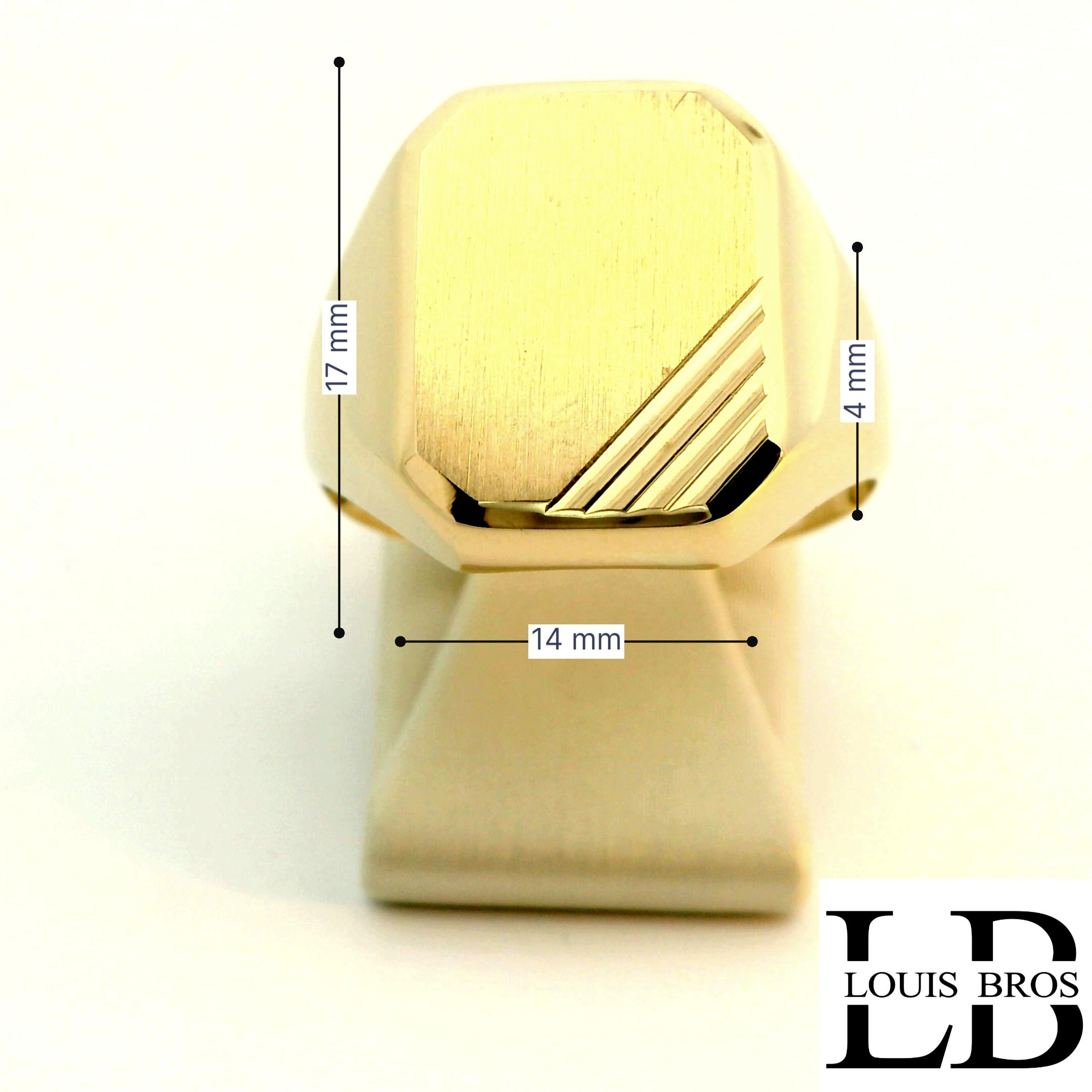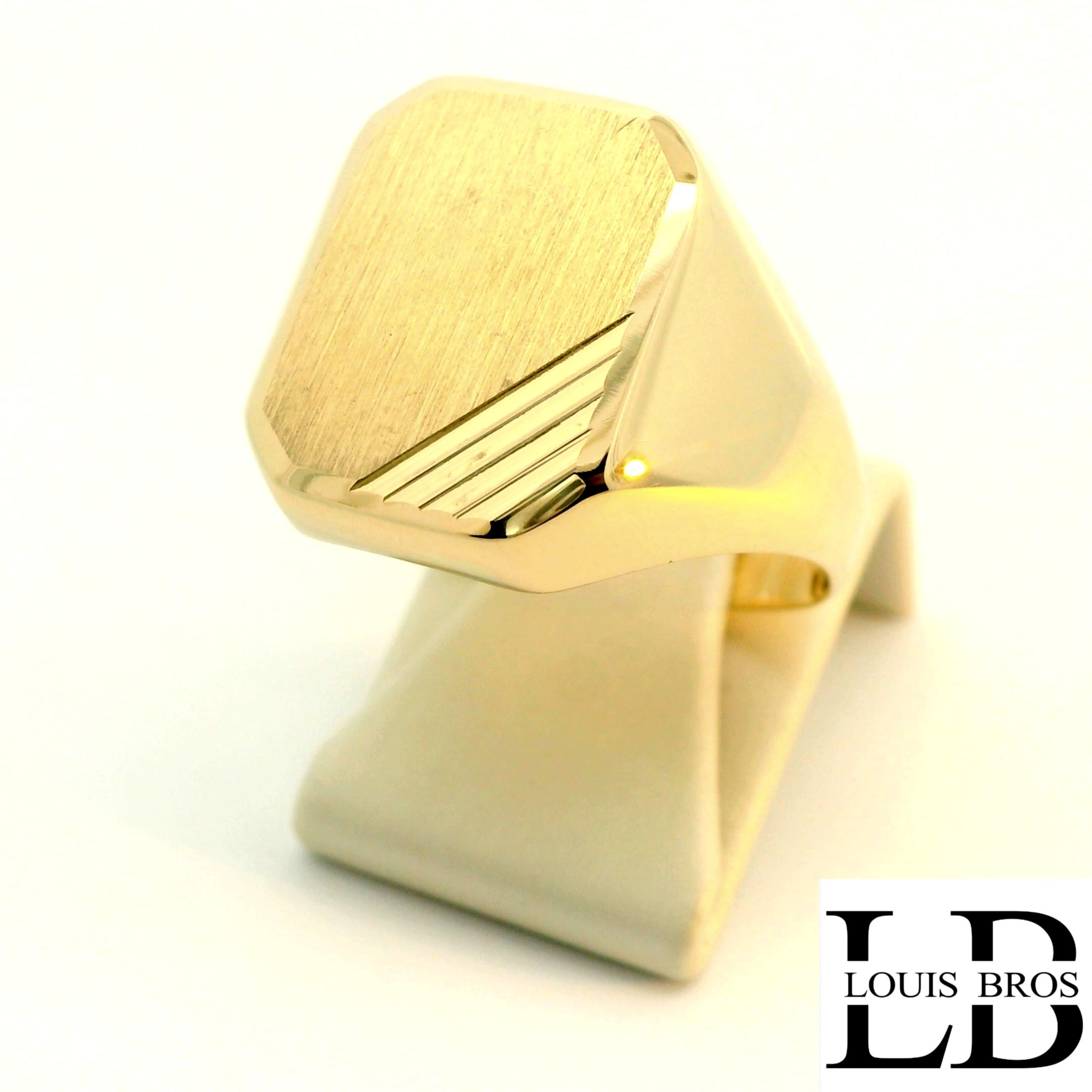 Deze heren zegelring van 14 karaat geelgoud (5.75 gr) heeft een krachtig en tijdloos ontwerp. De bovenkant van de ring is strak en mat geborsteld afgewerkt, wat zorgt voor een elegante en ingetogen uitstraling. Subtiele, schuin geplaatste lijnen aan de zijkant van de zegel geven de ring extra diepte en karakter, zonder het klassieke ontwerp te doorbreken. De solide vorm en comfortabele pasvorm maken deze ring uitermate geschikt voor dagelijks gebruik. Een klassieke zegelring voor de man die houdt van eenvoud, kwaliteit en vakmanschap.
