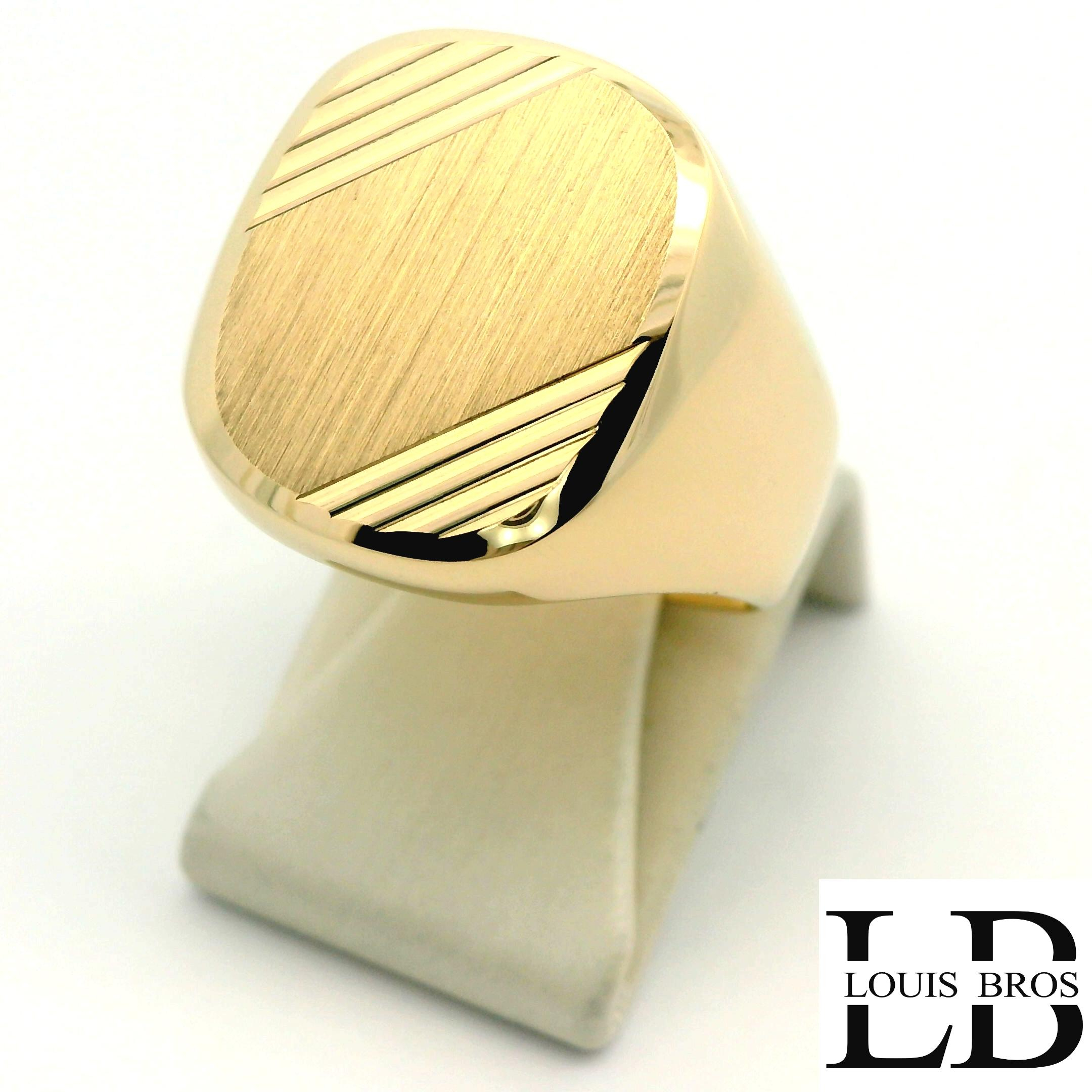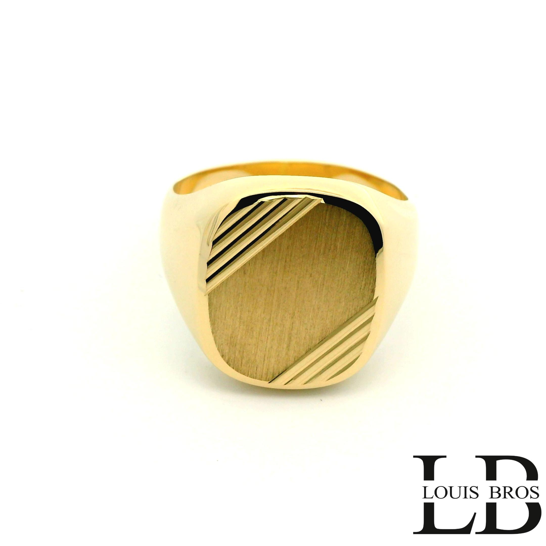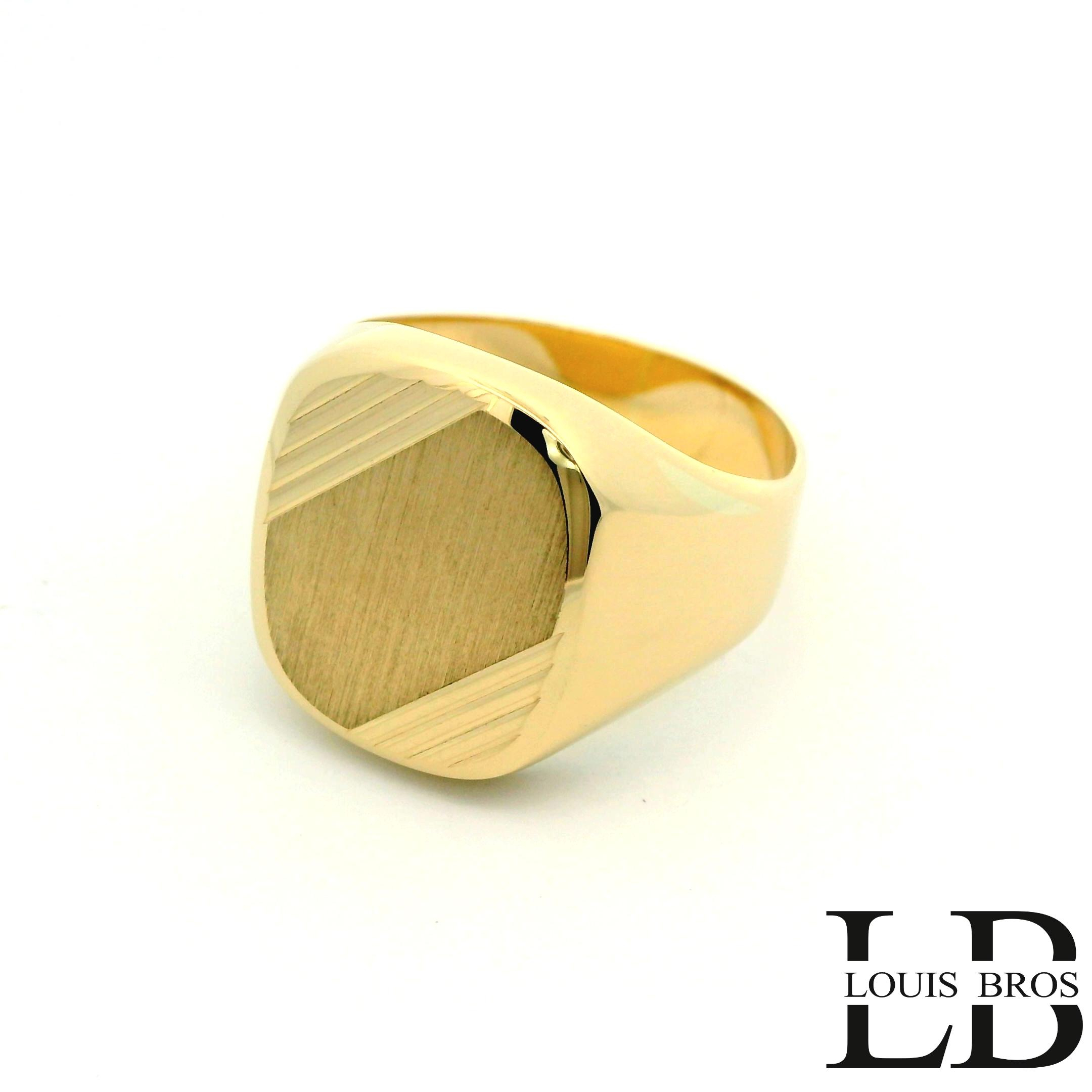 Deze heren zegelring van 14 karaat geelgoud (6.68 gr) heeft een krachtig en tijdloos ontwerp. De bovenkant van de ring is strak en mat geborsteld afgewerkt, wat zorgt voor een elegante en ingetogen uitstraling. Subtiele, schuin geplaatste lijnen aan de zijkant van de zegel geven de ring extra diepte en karakter, zonder het klassieke ontwerp te doorbreken. De solide vorm en comfortabele pasvorm maken deze ring uitermate geschikt voor dagelijks gebruik. Een klassieke zegelring voor de man die houdt van eenvoud, kwaliteit en vakmanschap.